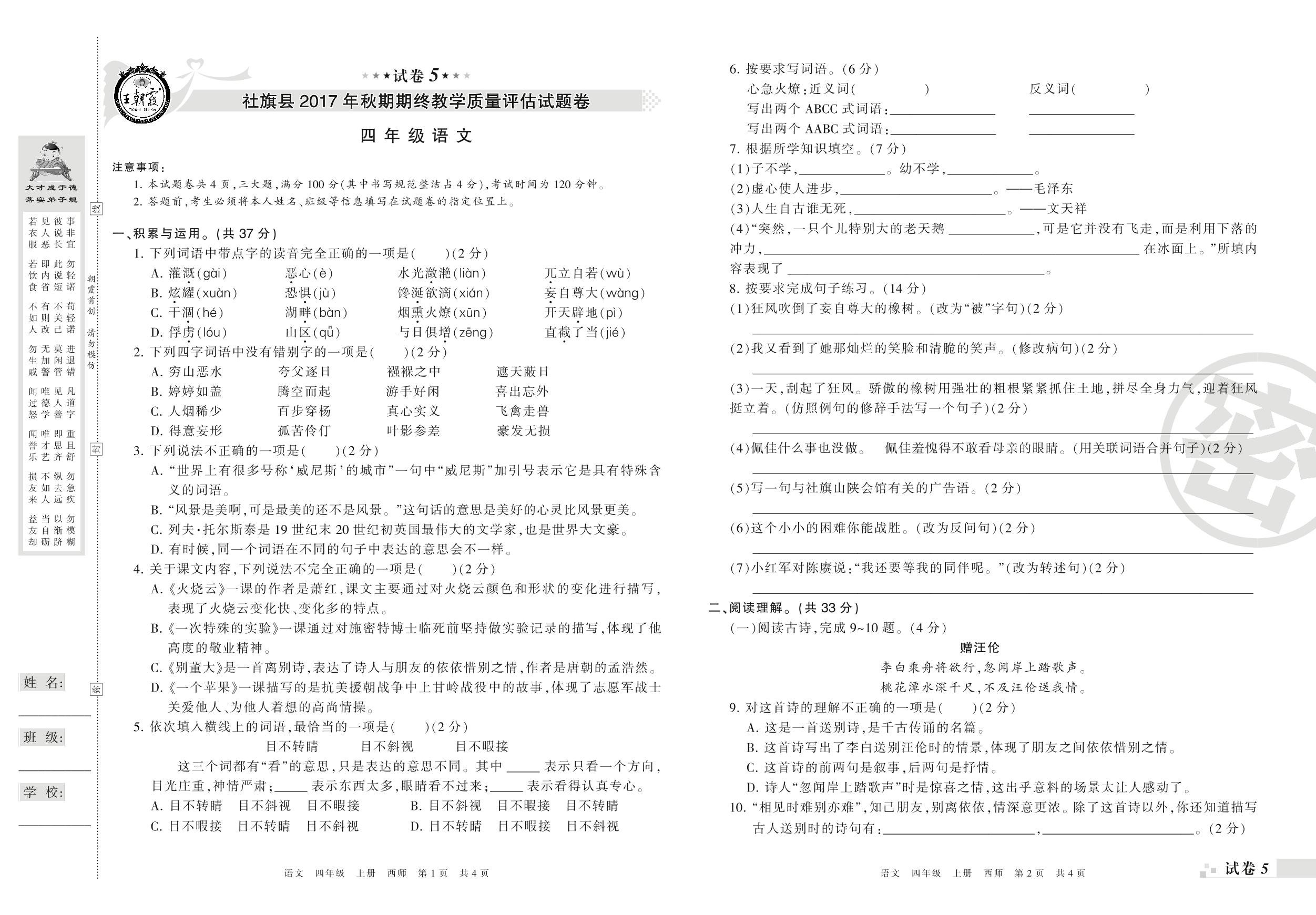 2017-2018学年第一学期南阳市社旗县四年级语文试卷(西师版)【5】