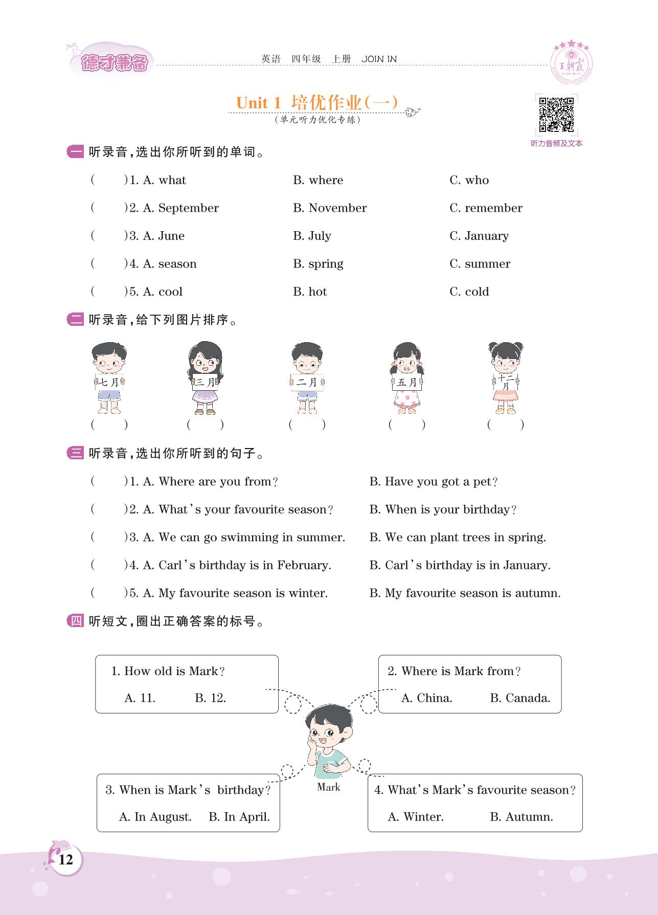 2021上册四年级英语剑桥版 Unit 1 培优作业(一)