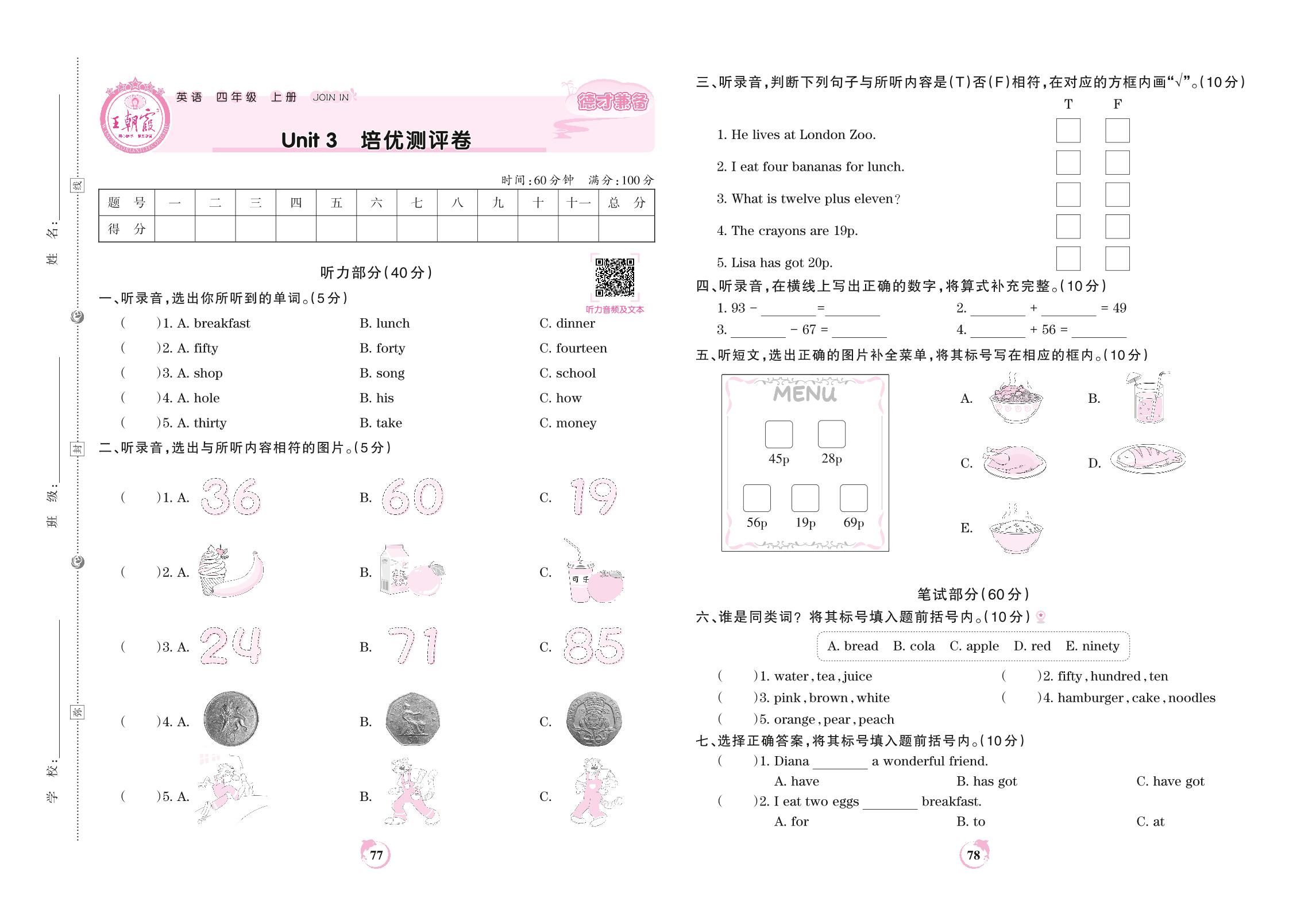 2021上册四年级英语剑桥版 Unit 3 培优测评卷
