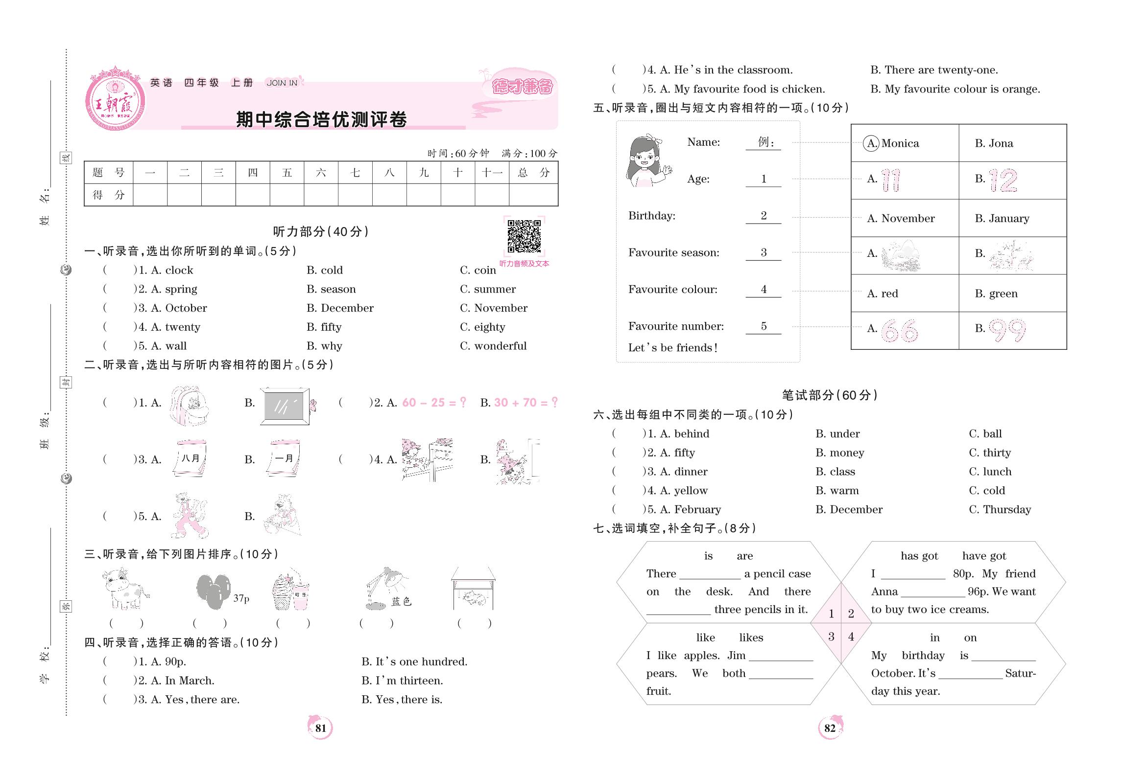 2021上册四年级英语剑桥版 期中综合培优测评卷