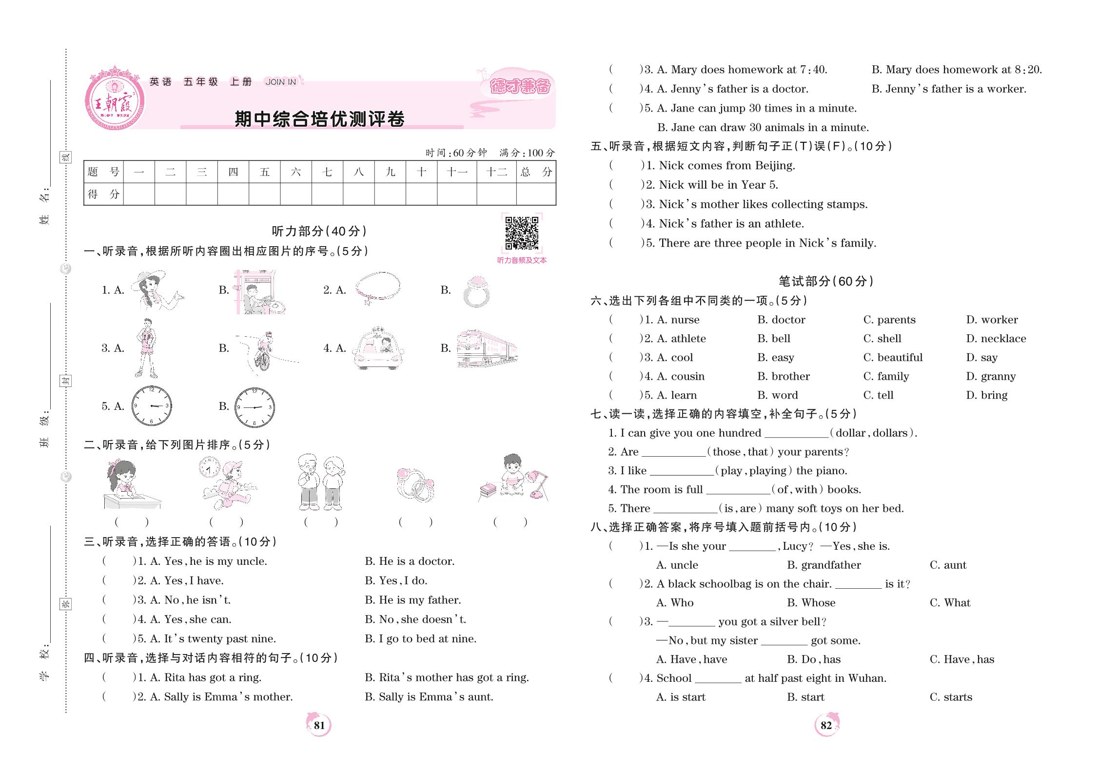 2021上册五年级英语剑桥版 期中综合培优测评卷