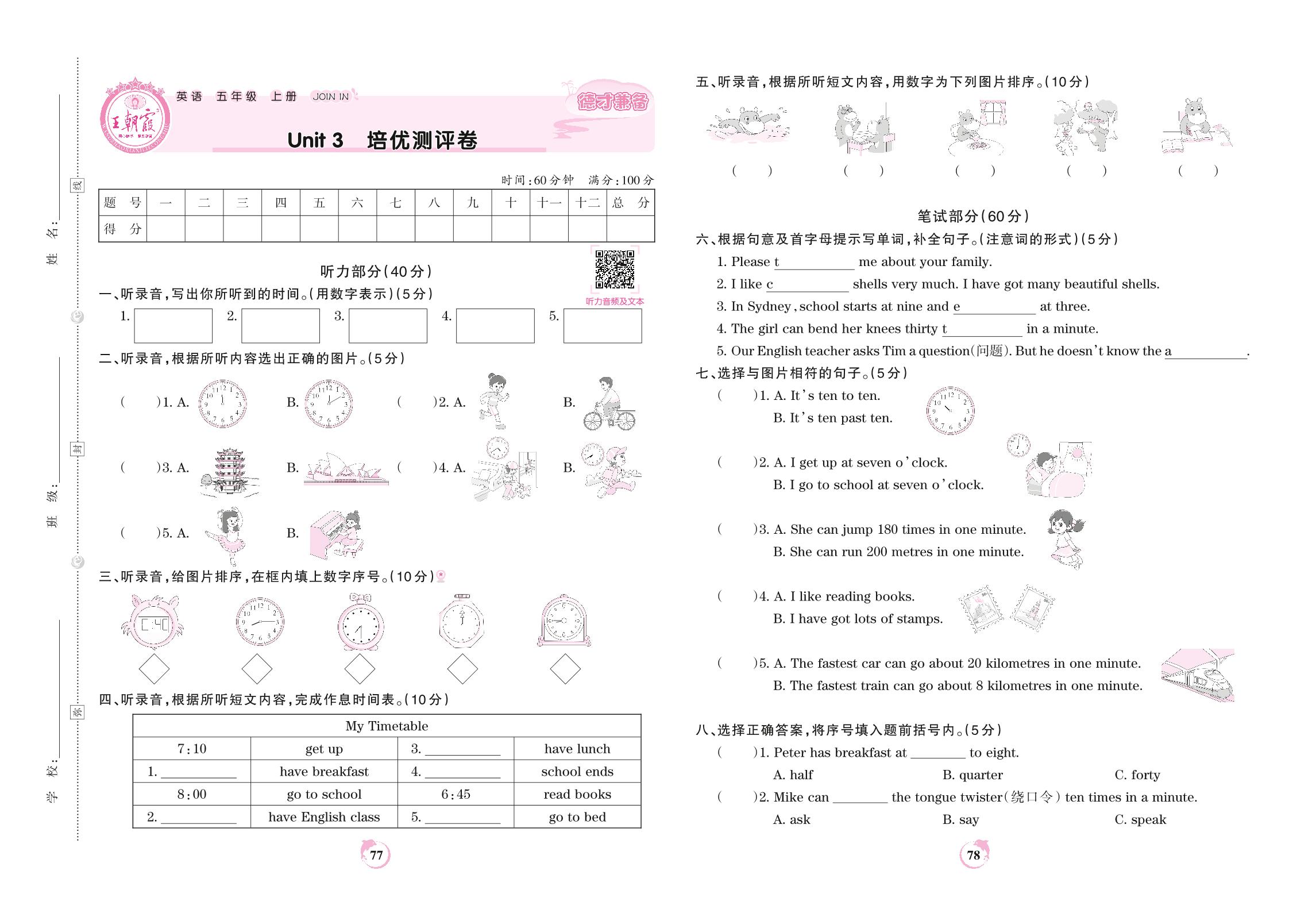2021上册五年级英语剑桥版 Unit 3 培优测评卷