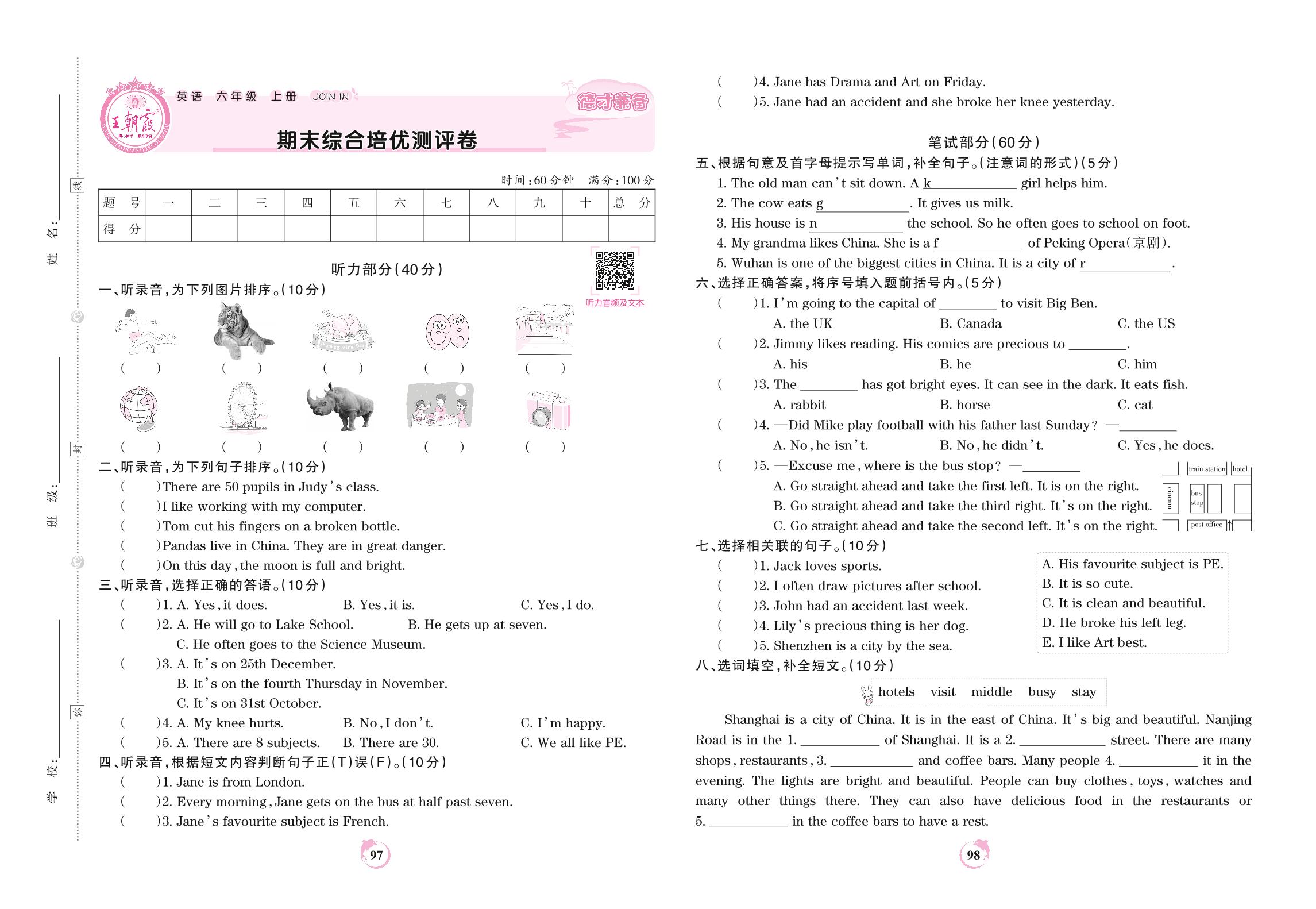 2021上册六年级英语剑桥版 期末综合培优测评卷