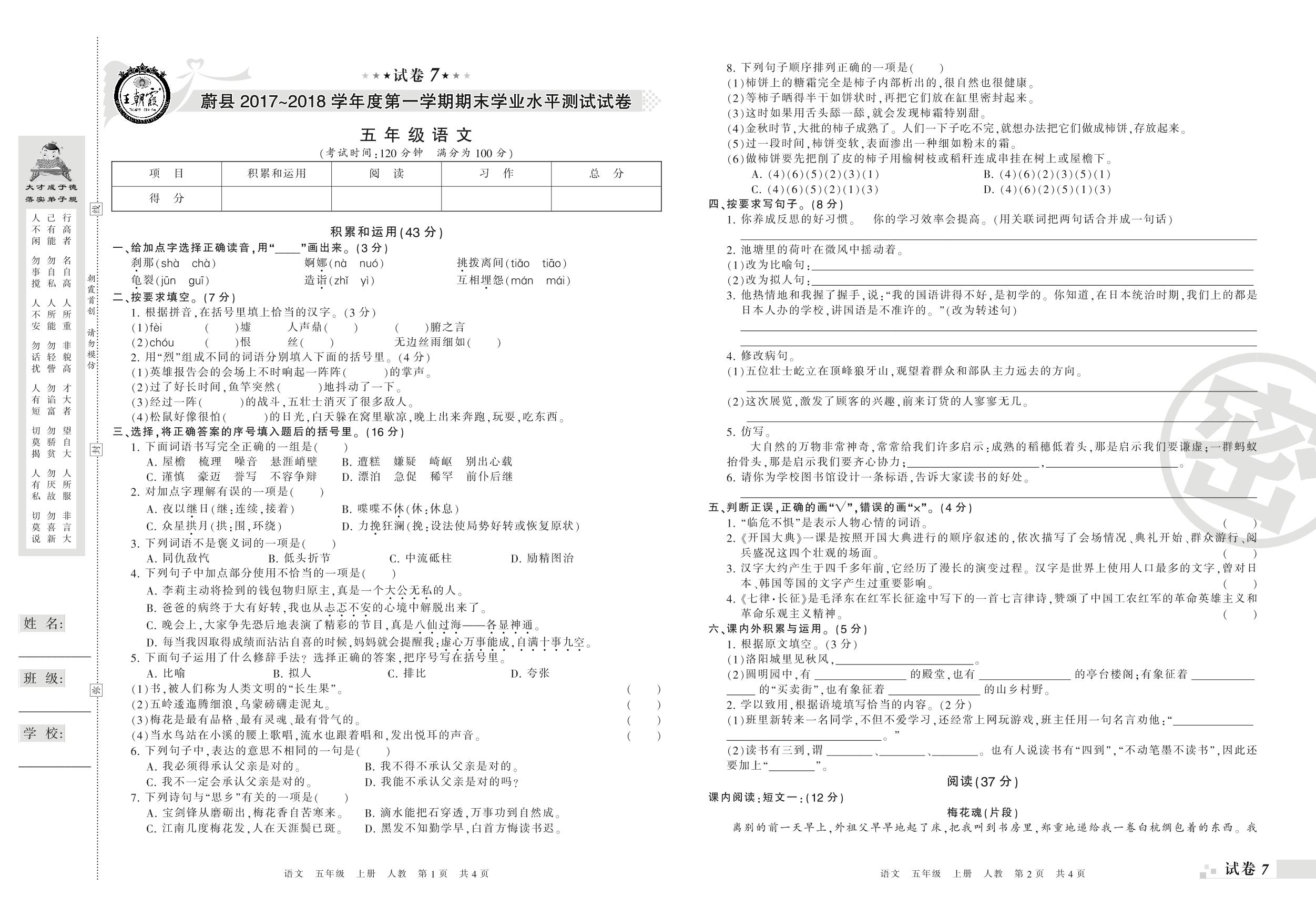 2017-2018学年第一学期张家口市蔚县五年级语文试卷(人教版)【7】