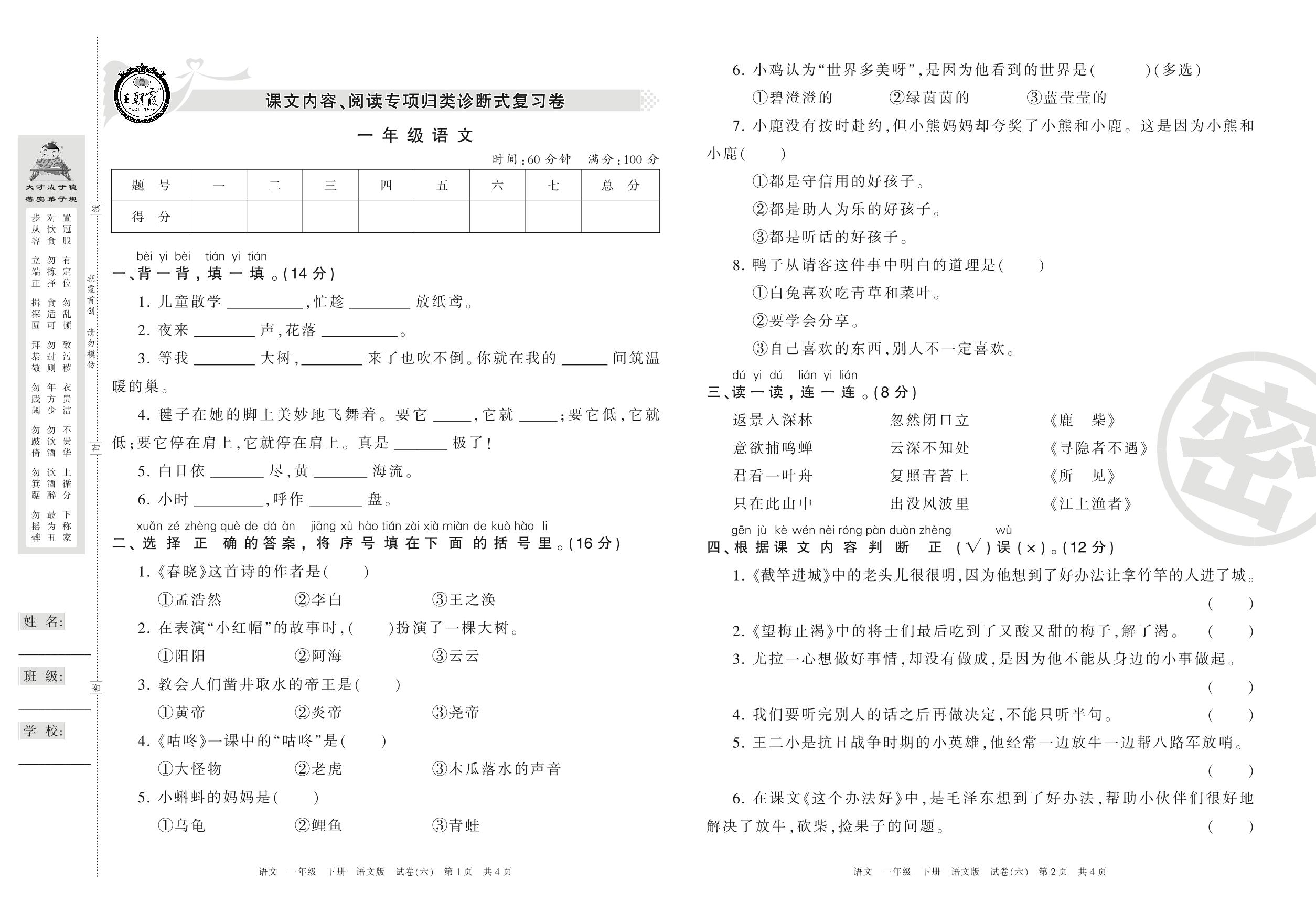王朝霞期末专项卷一年级下册语文(语文版)【6】