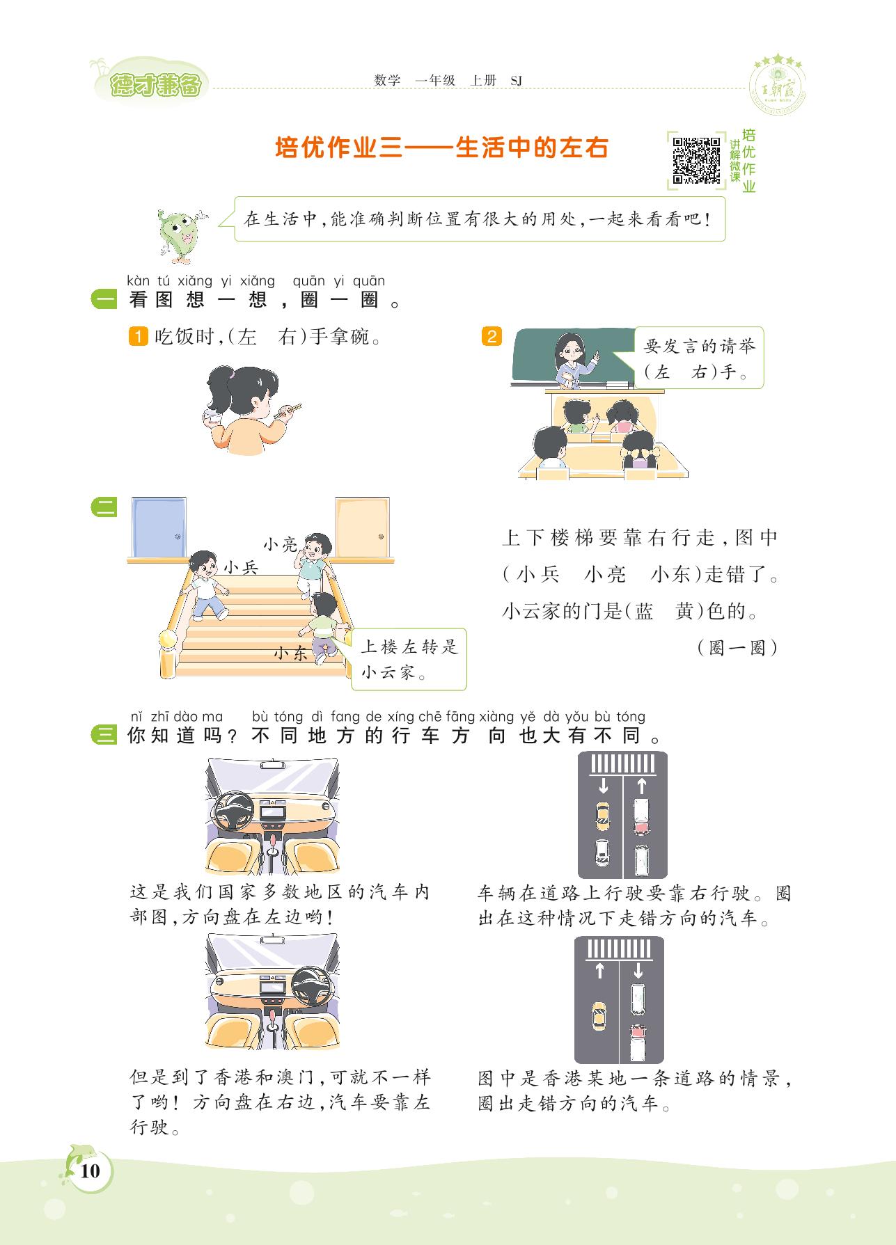 2021上册一年级数学苏教版 第四单元——培优作业三 生活中的左右