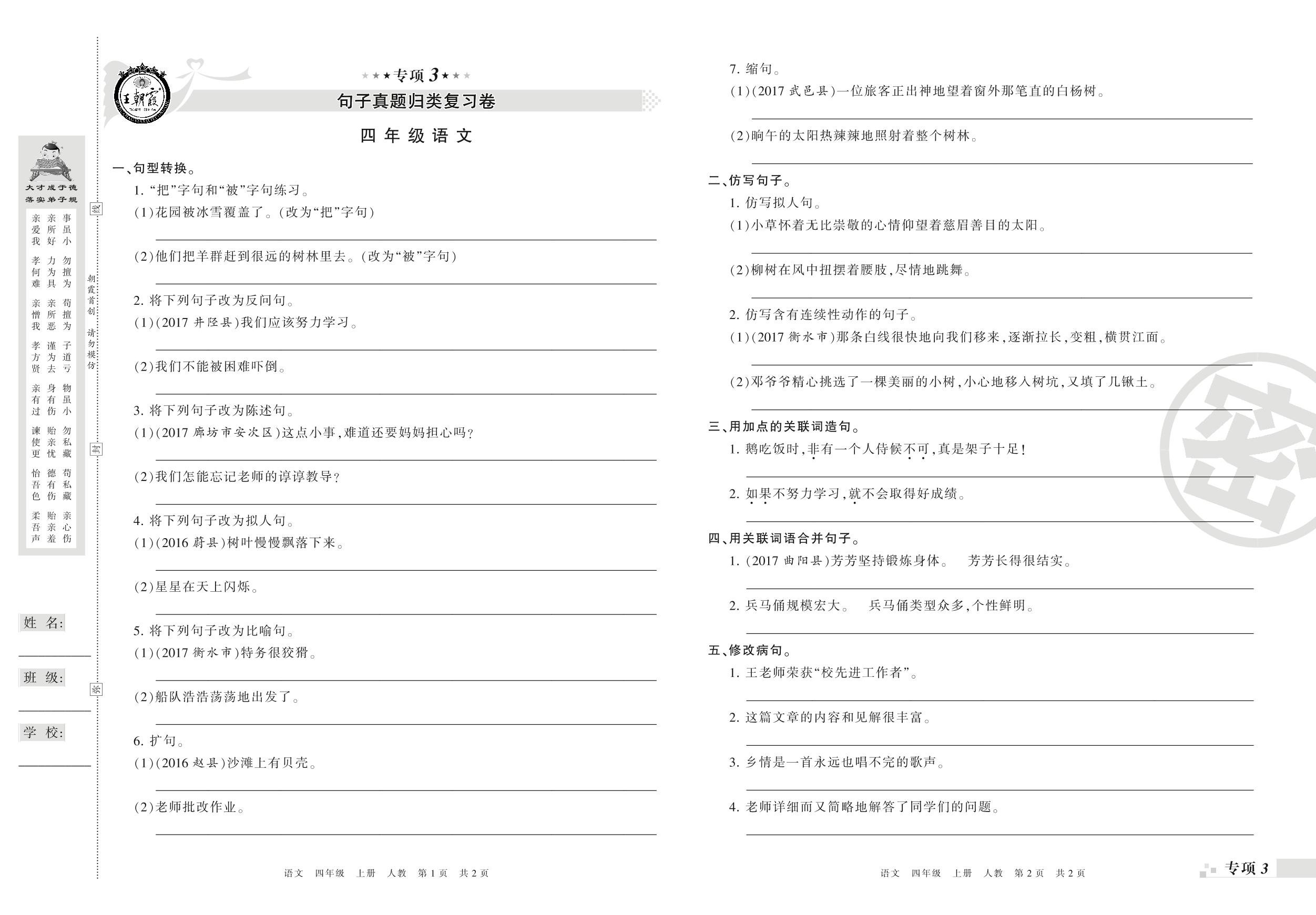 王朝霞期末专项卷——句子、课文内容真题归类复习四年级上册语文(人教版)_R210801223933【0】