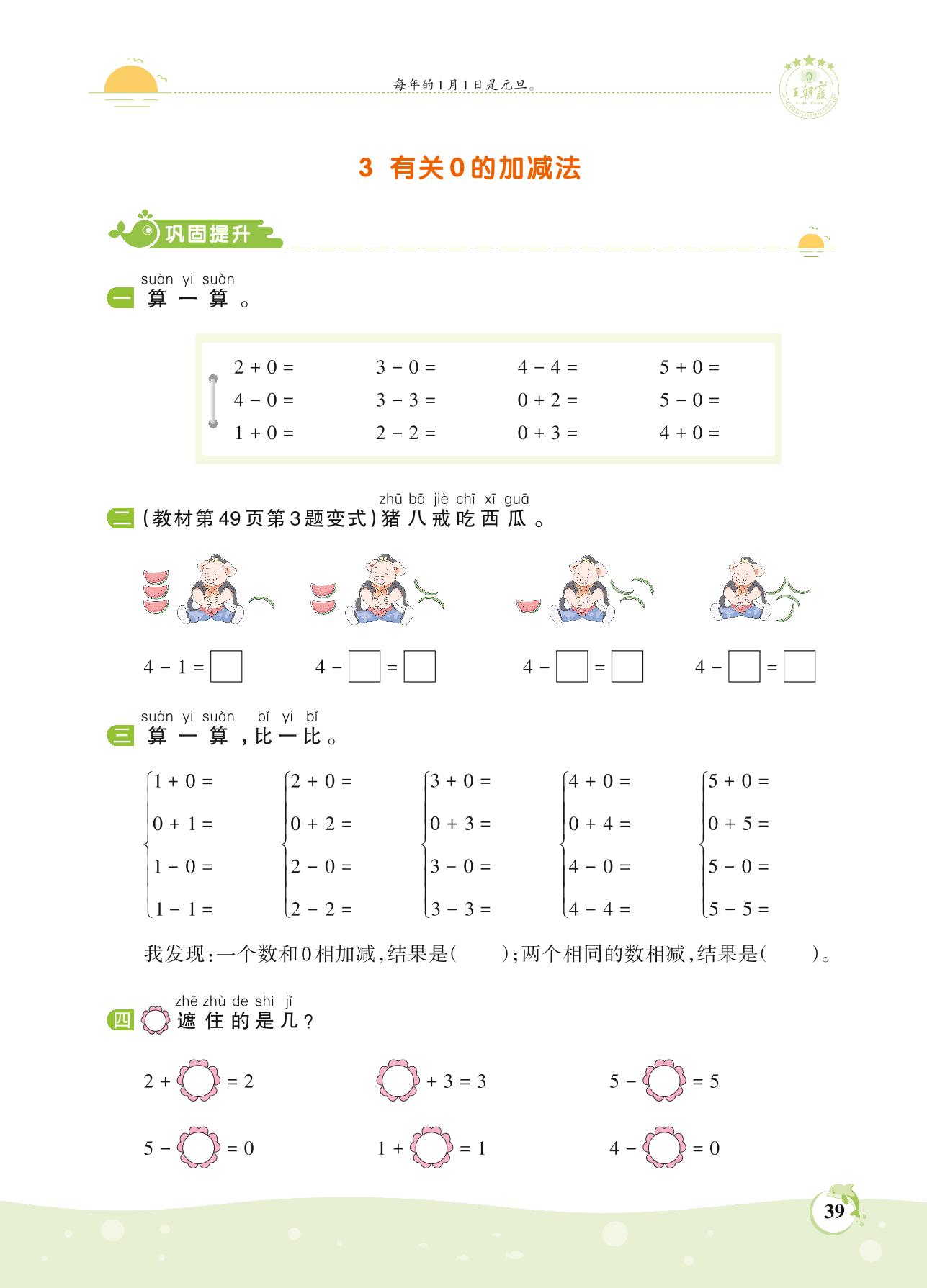 2021上册一年级数学苏教版 第八单元——3 有关0的加减法