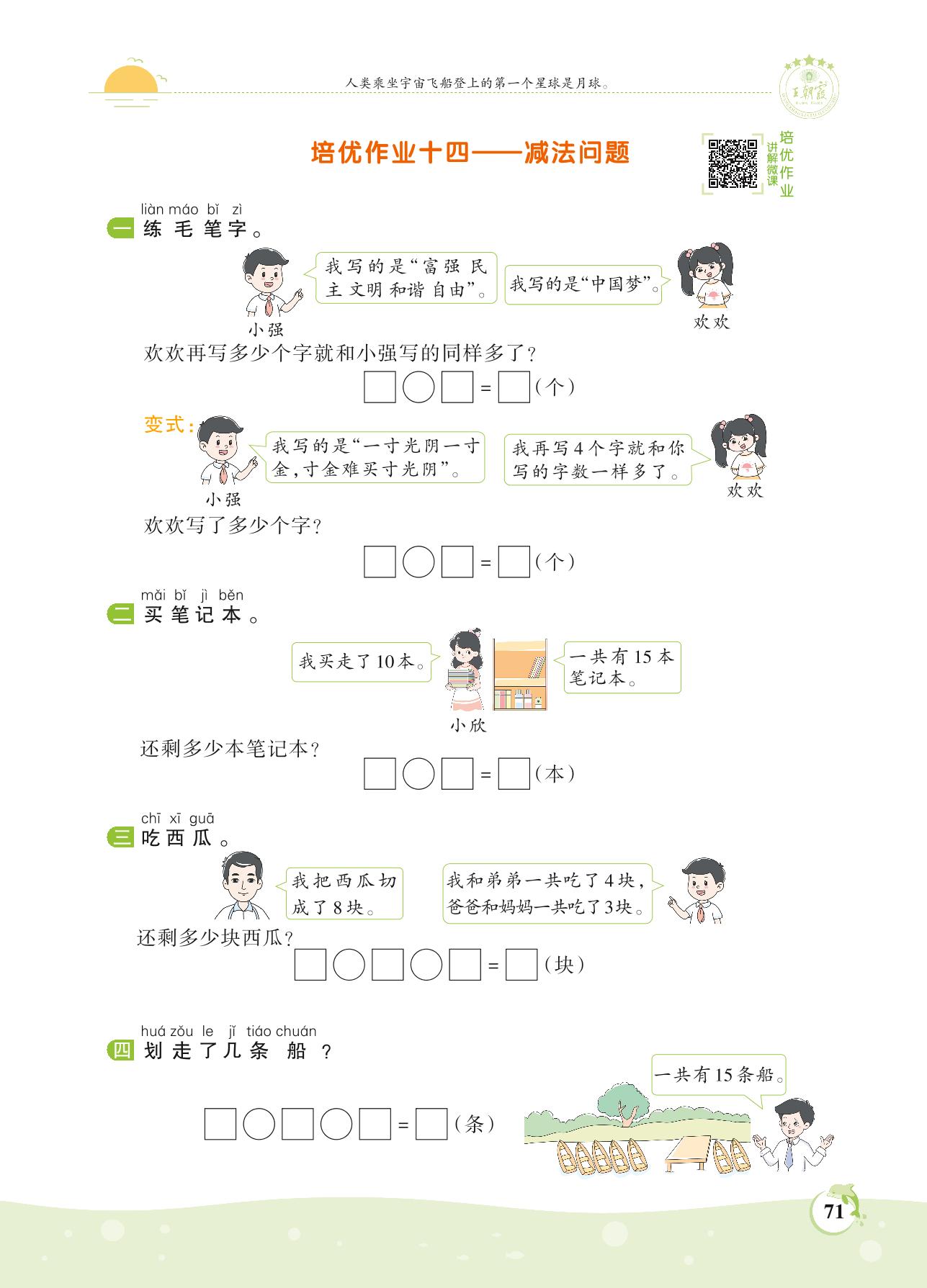 2021上册一年级数学苏教版 第十单元——培优作业十四 减法问题