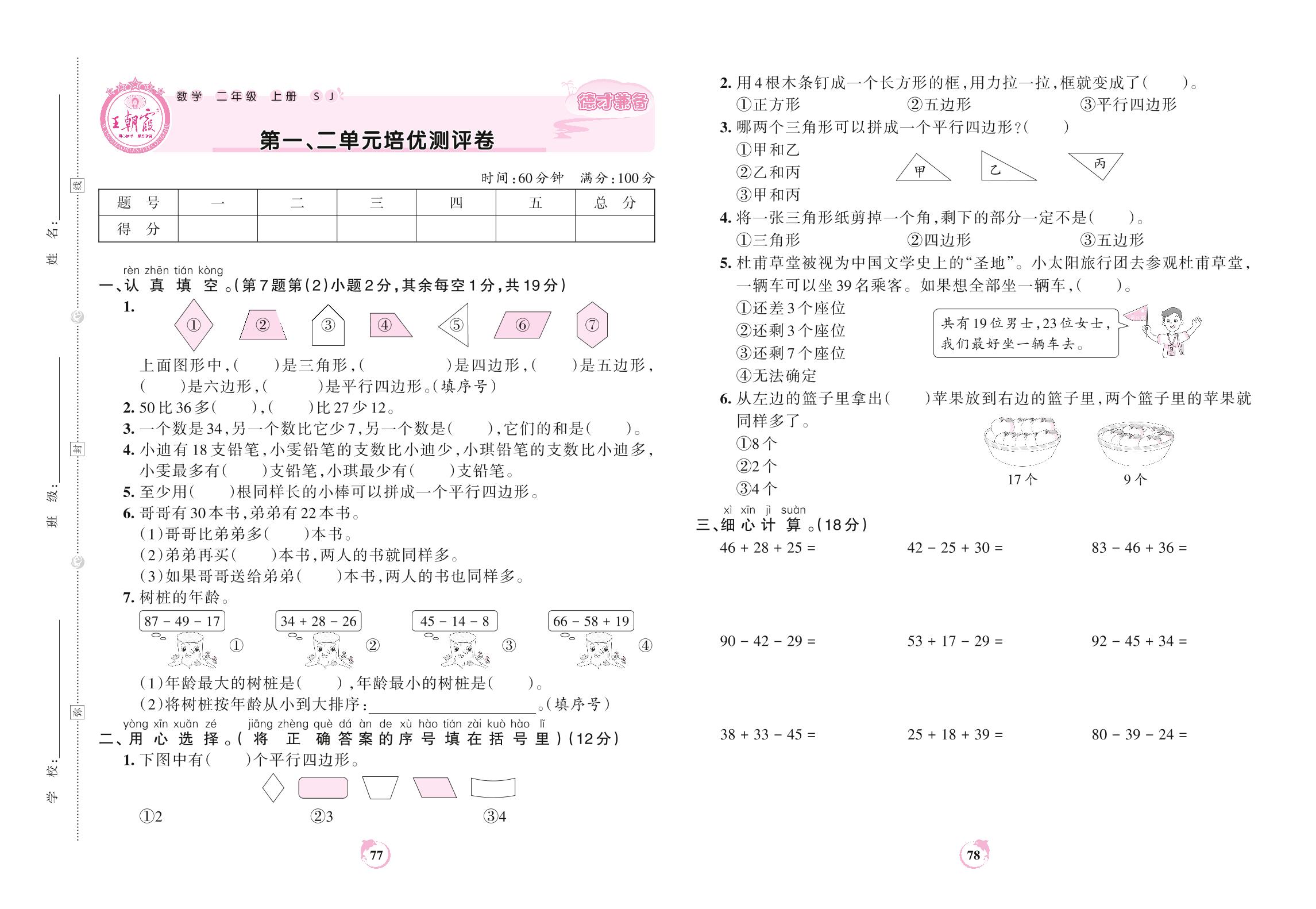 2021上册二年级数学苏教版 第一、二单元培优测评卷
