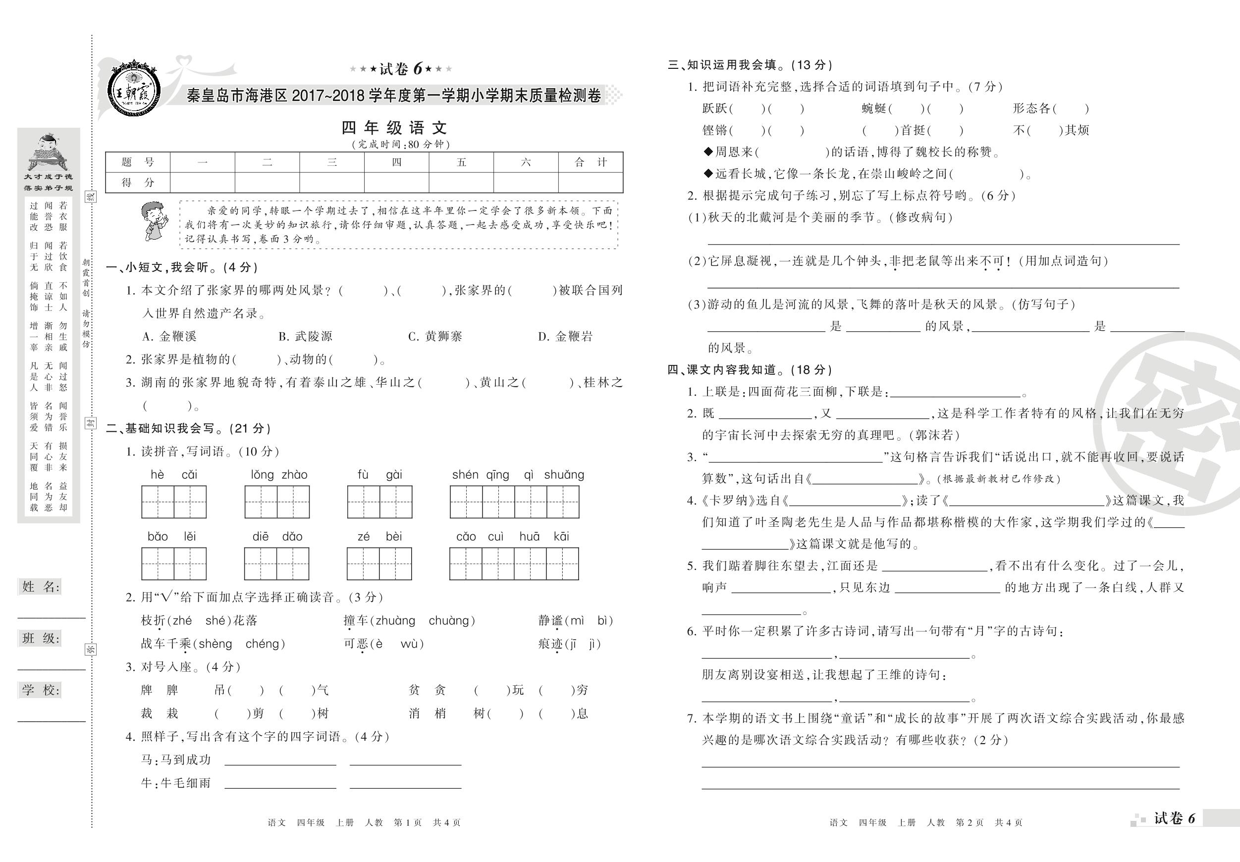 2017-2018学年第一学期秦皇岛市海港区四年级语文试卷(人教版)【6】