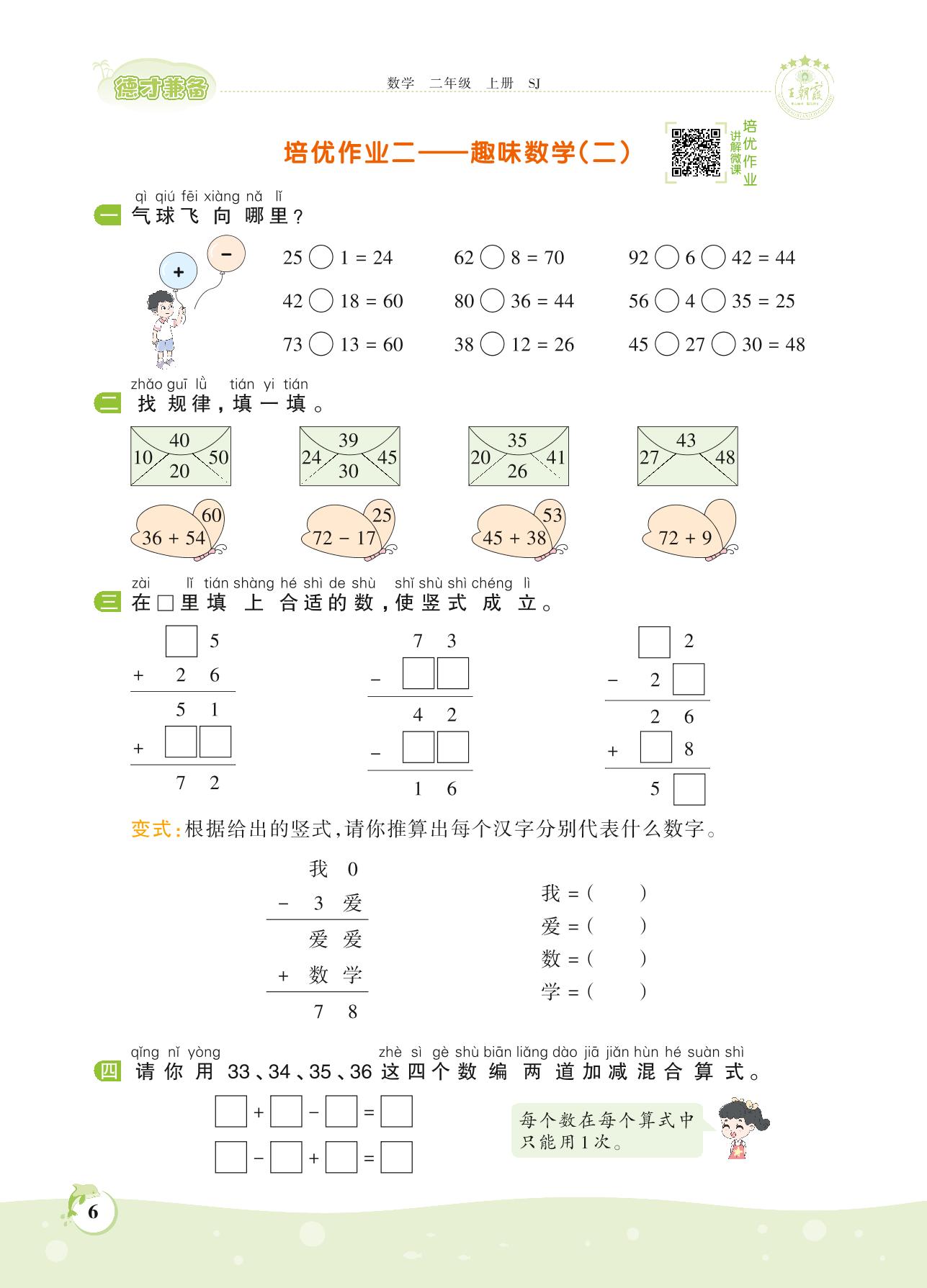 2021上册二年级数学苏教版 第一单元——培优作业二 趣味数学(二)