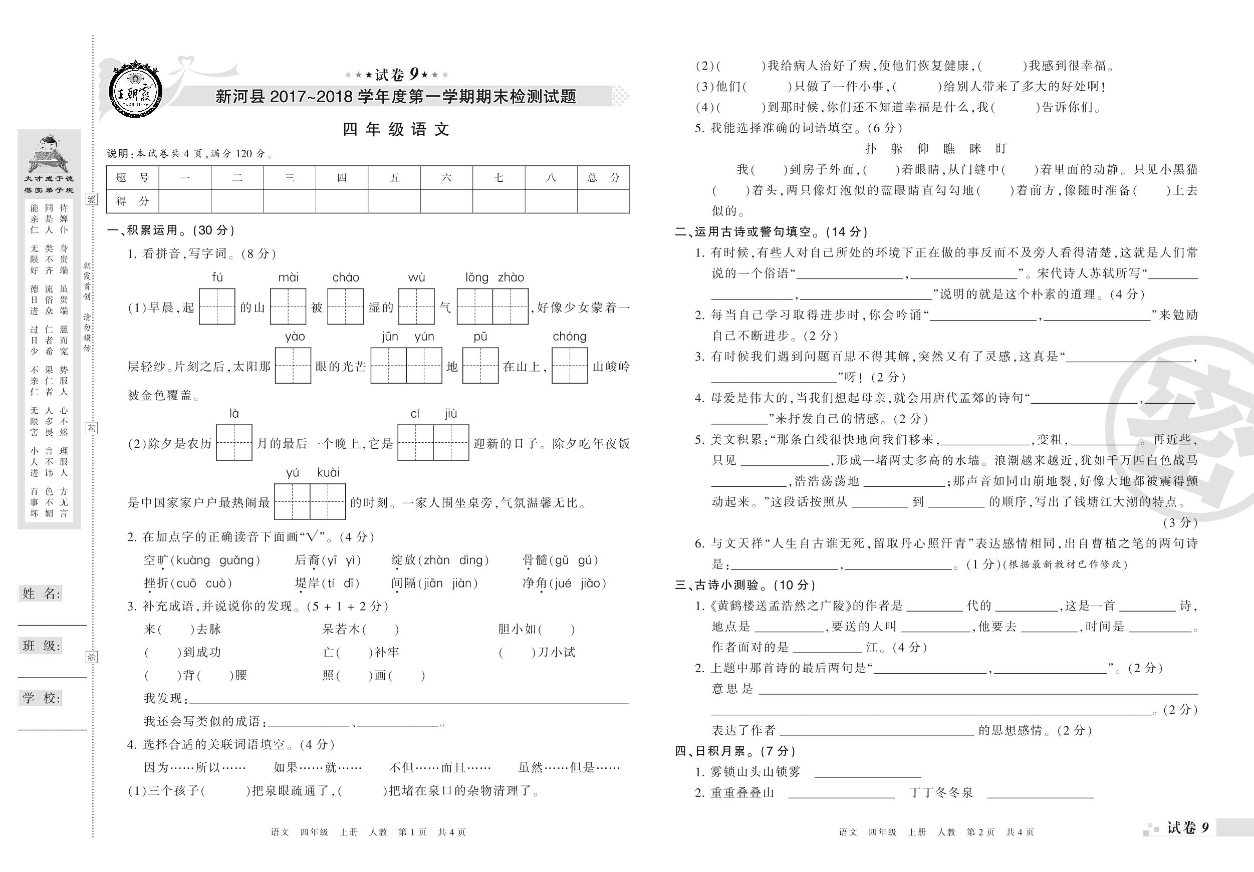 2017-2018学年第一学期邢台市新河县四年级语文试卷(人教版)【9】