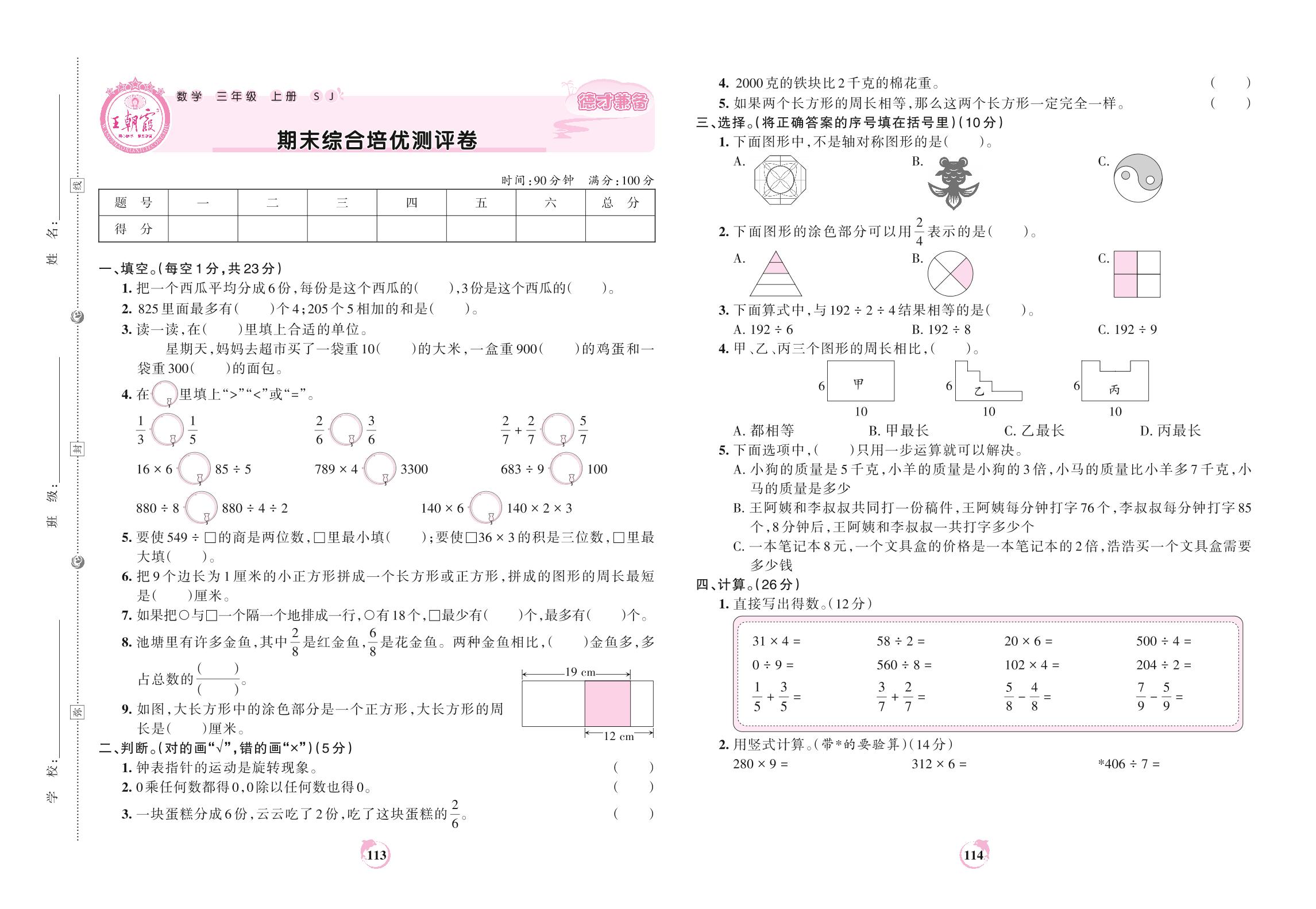 三年级数学苏教版上册期末卷