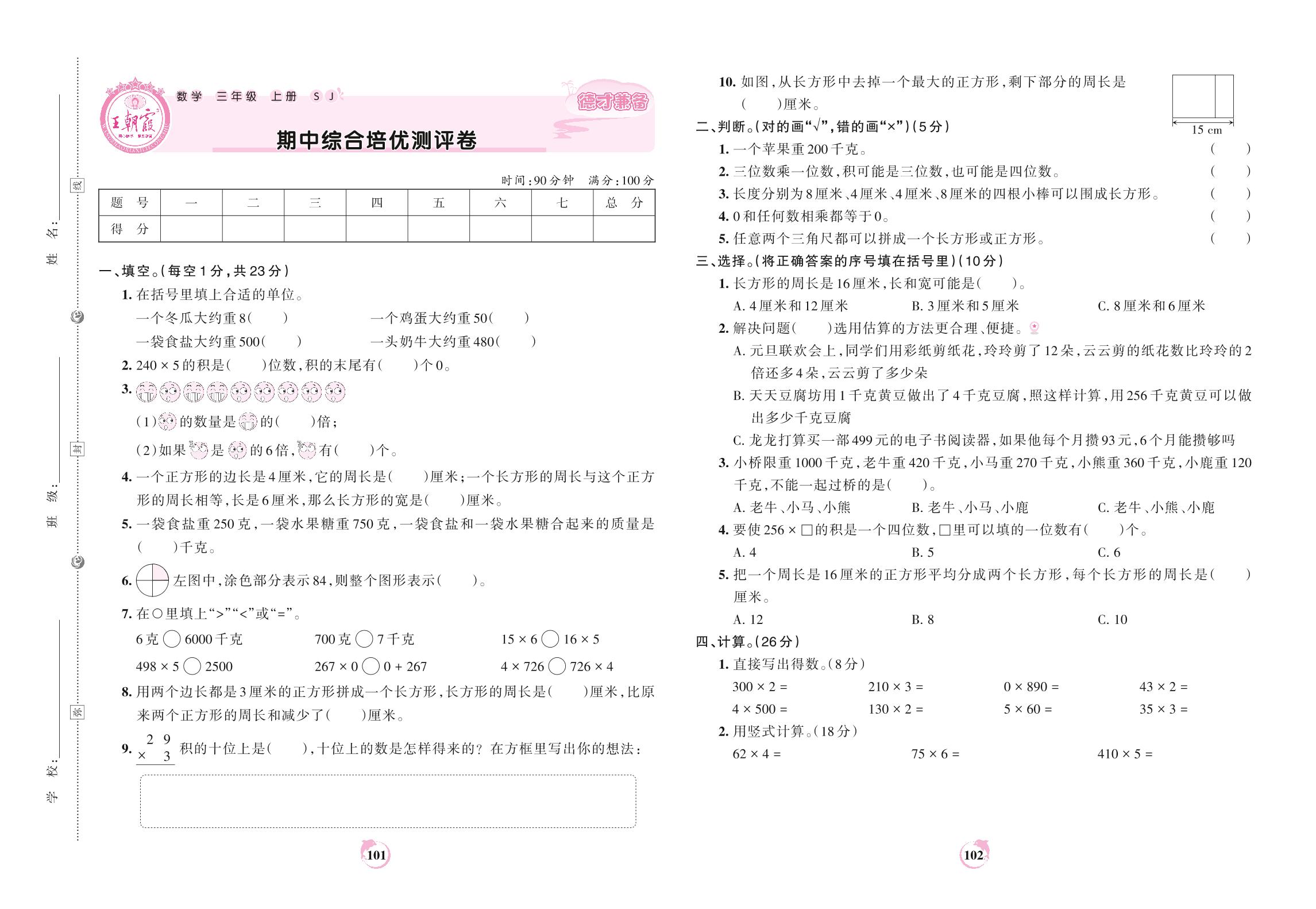 三年级数学苏教版上册期中卷