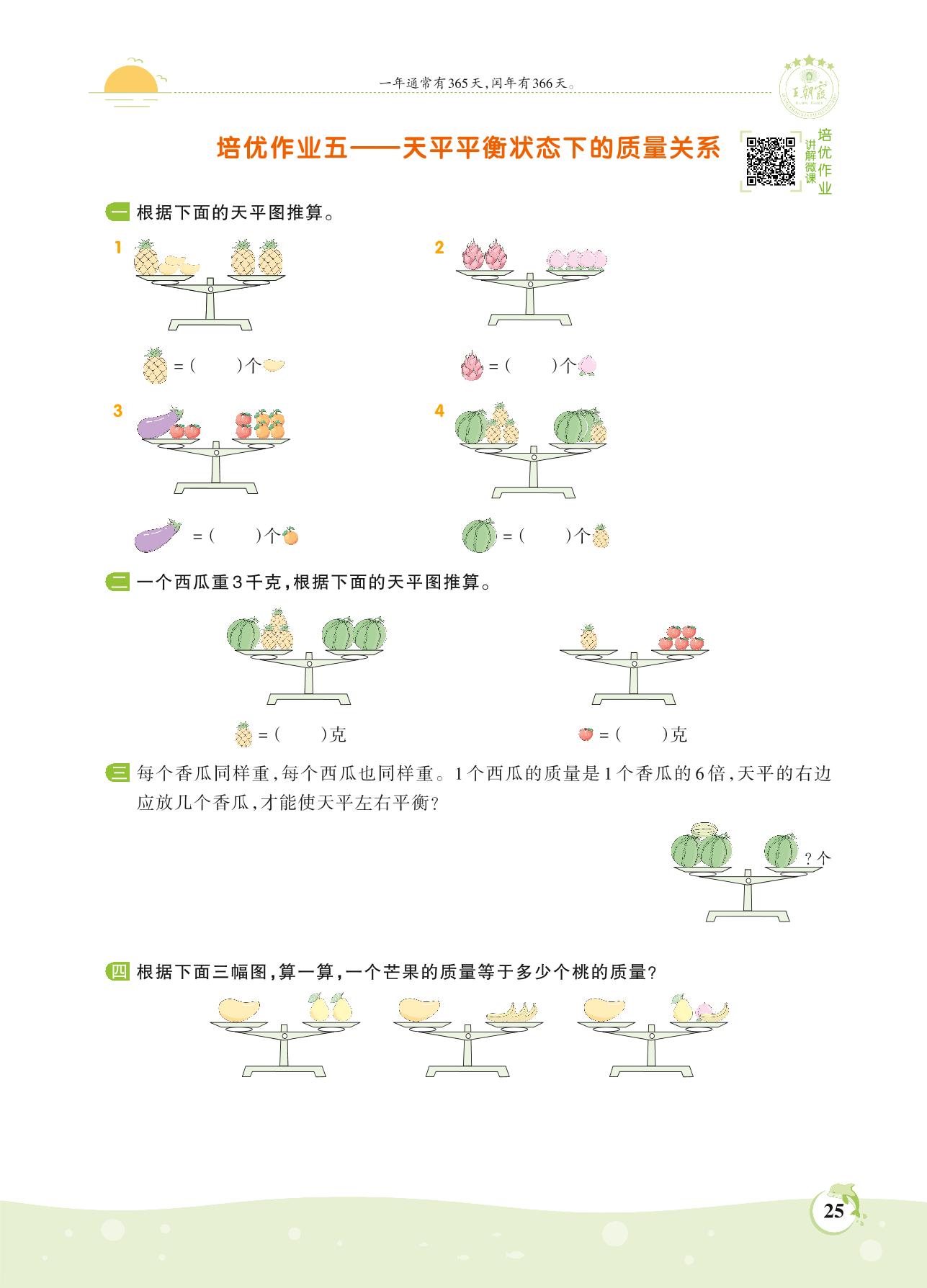 2021上册三年级数学苏教版 第二单元——培优作业五 天平平衡状态下的质量关系
