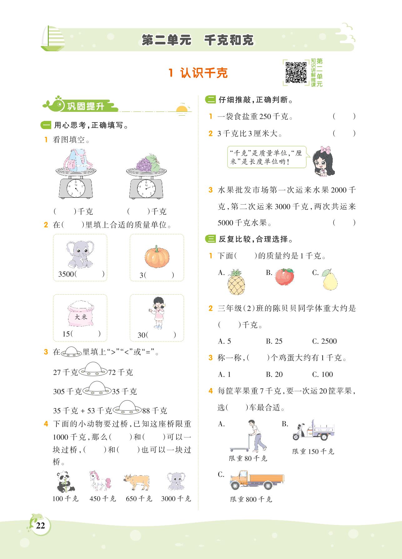 2021上册三年级数学苏教版 第二单元——1 认识千克