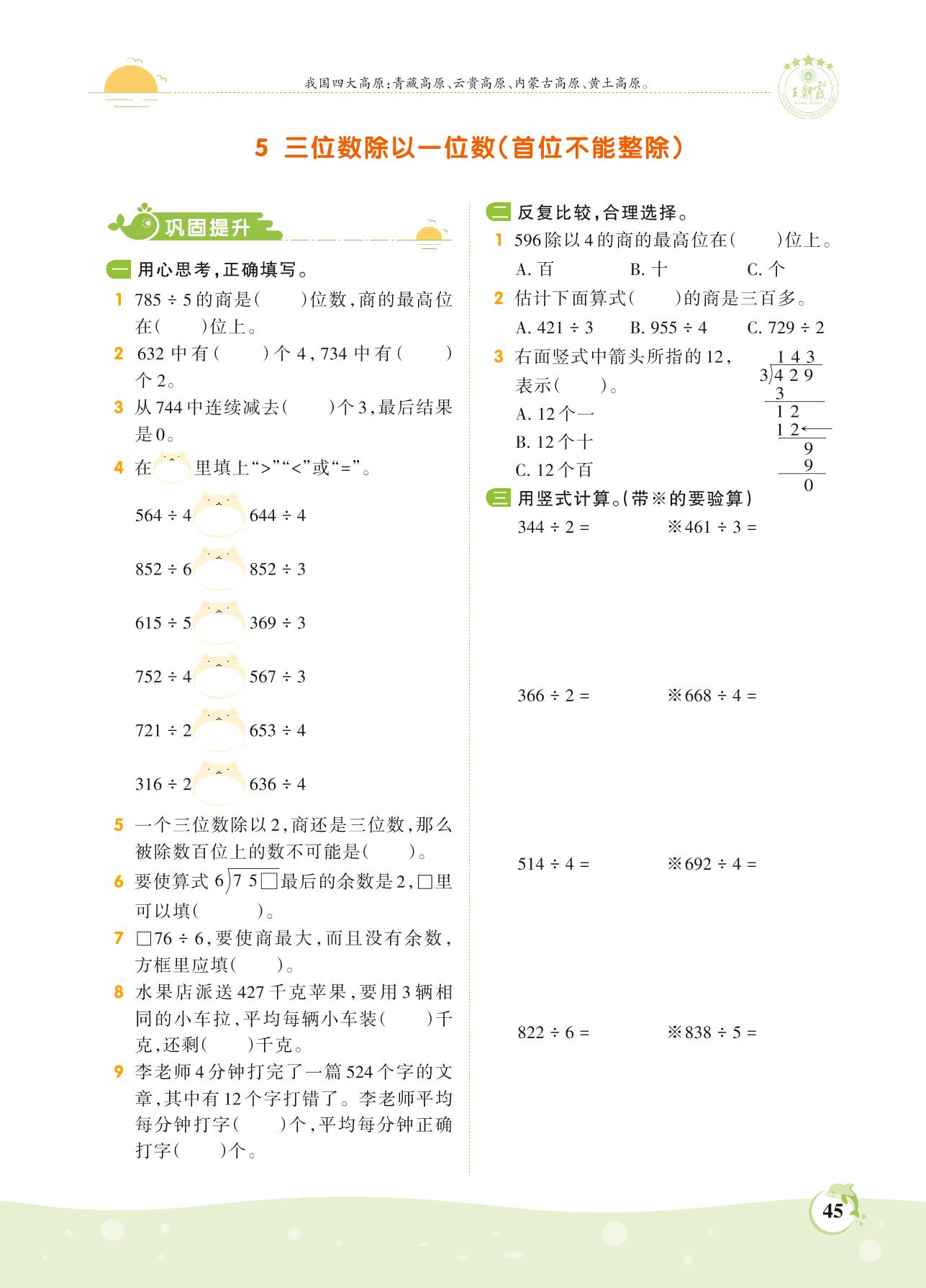 2021上册三年级数学苏教版 第四单元——5 三位数除以一位数(首位不能整除)