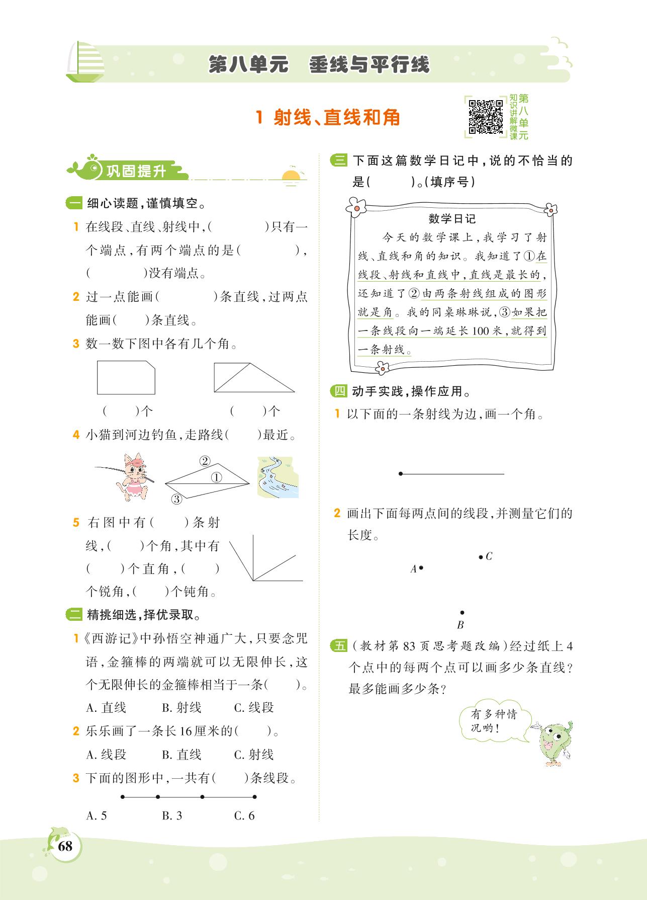 2021上册四年级数学苏教版 第八单元——1 射线、直线和角