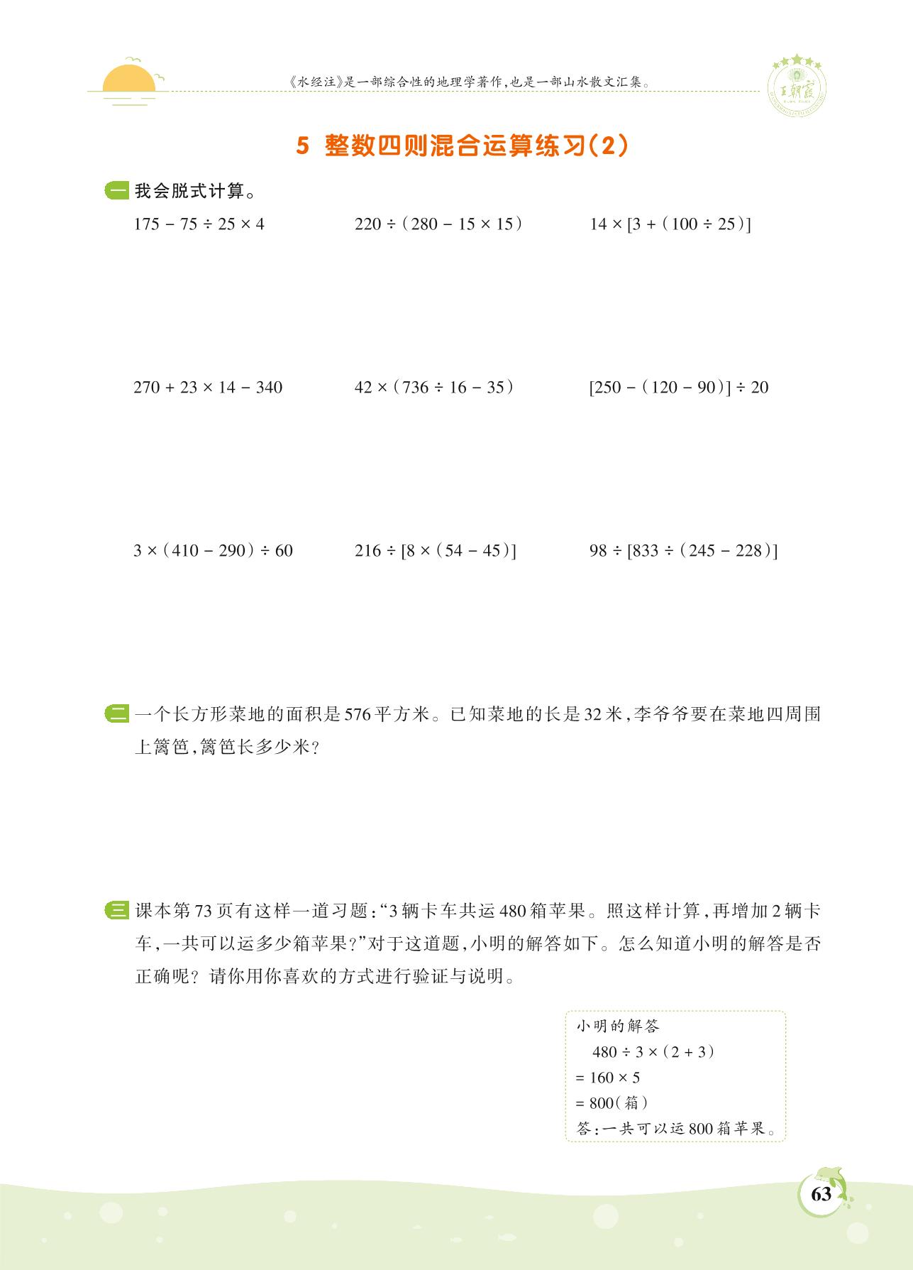 2021上册四年级数学苏教版 第七单元——5 整数四则混合运算练习(2)