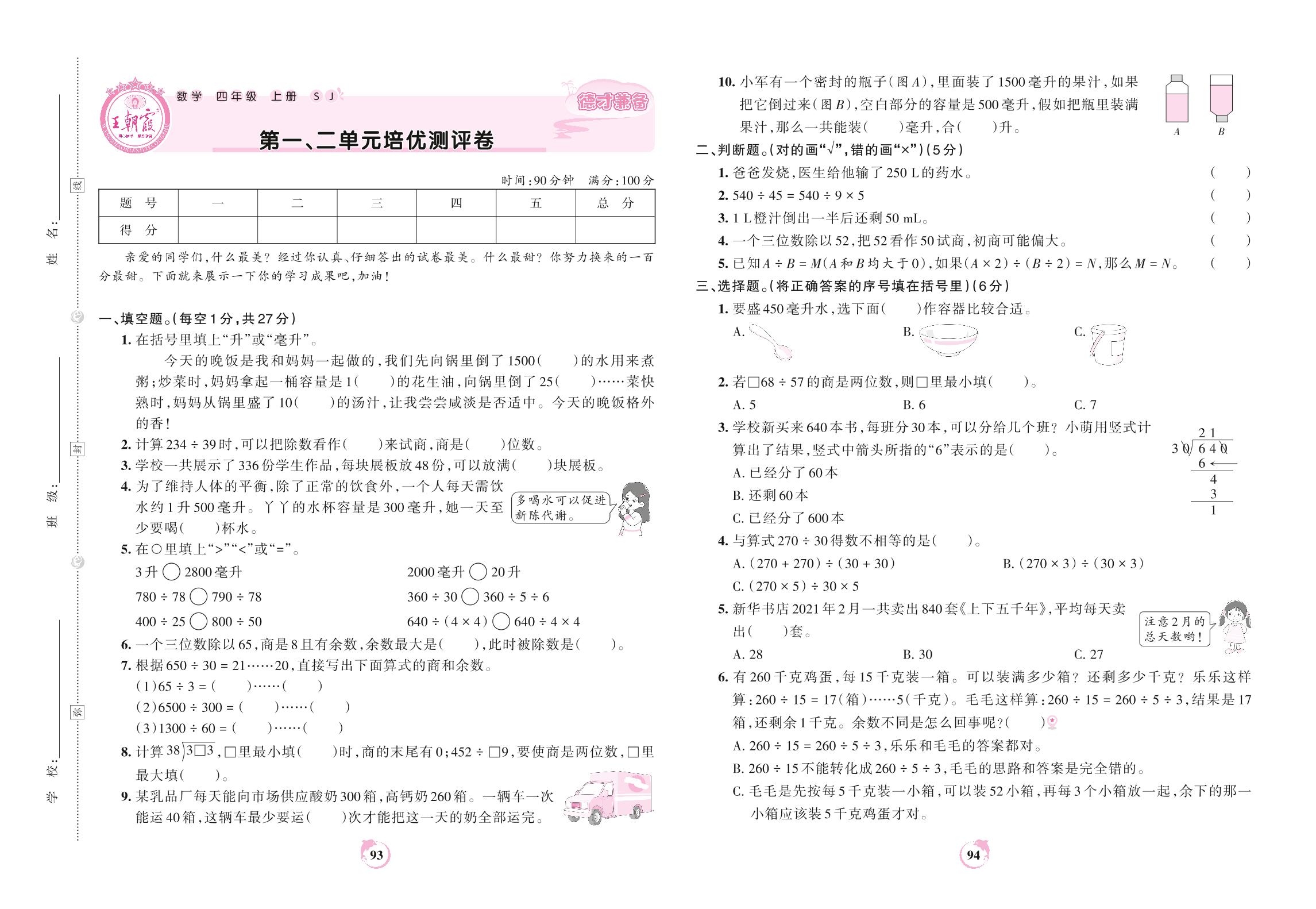 四年级数学苏教版上册单元卷