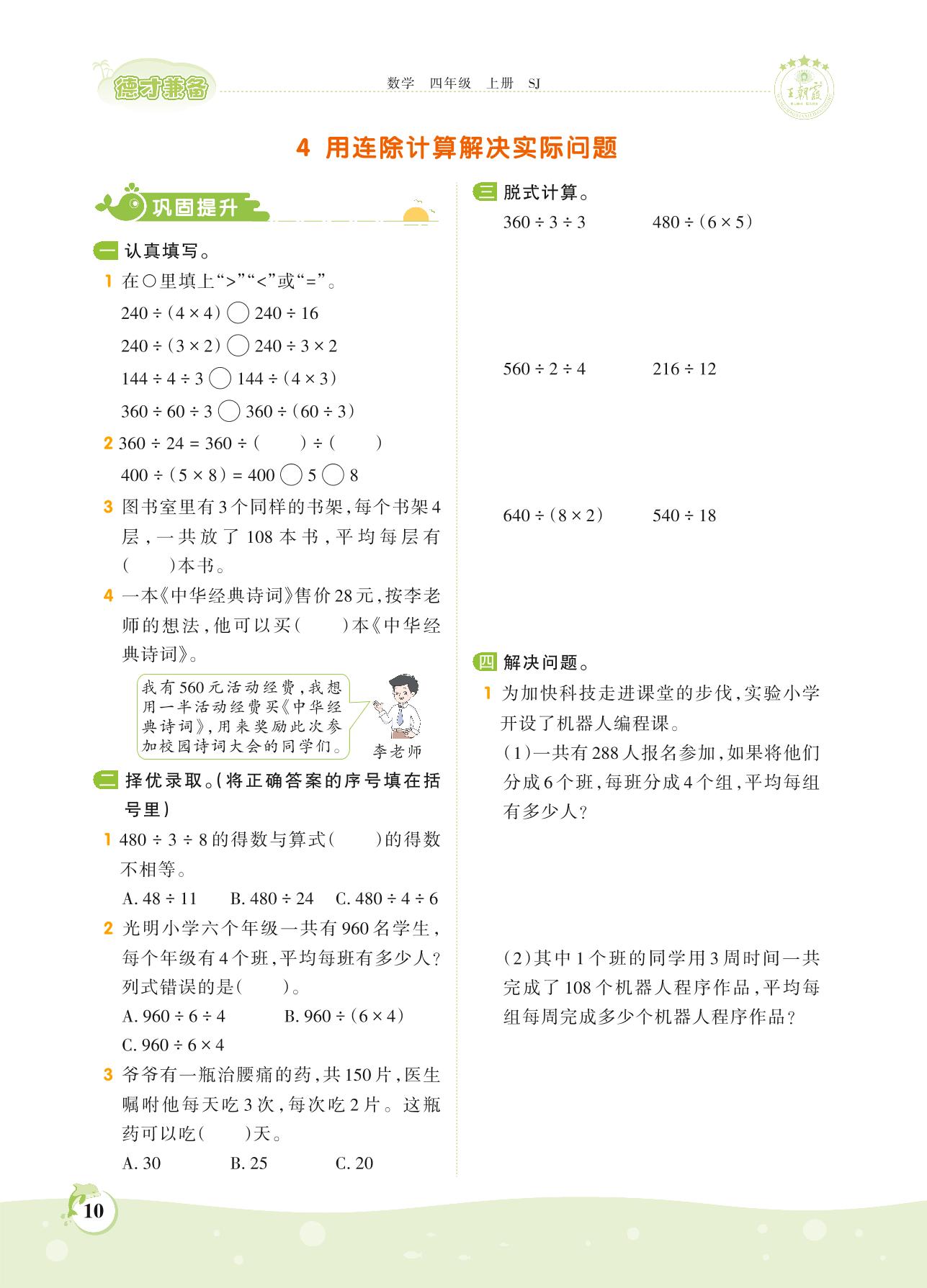 2021上册四年级数学苏教版 第二单元——4 用连除计算解决实际问题