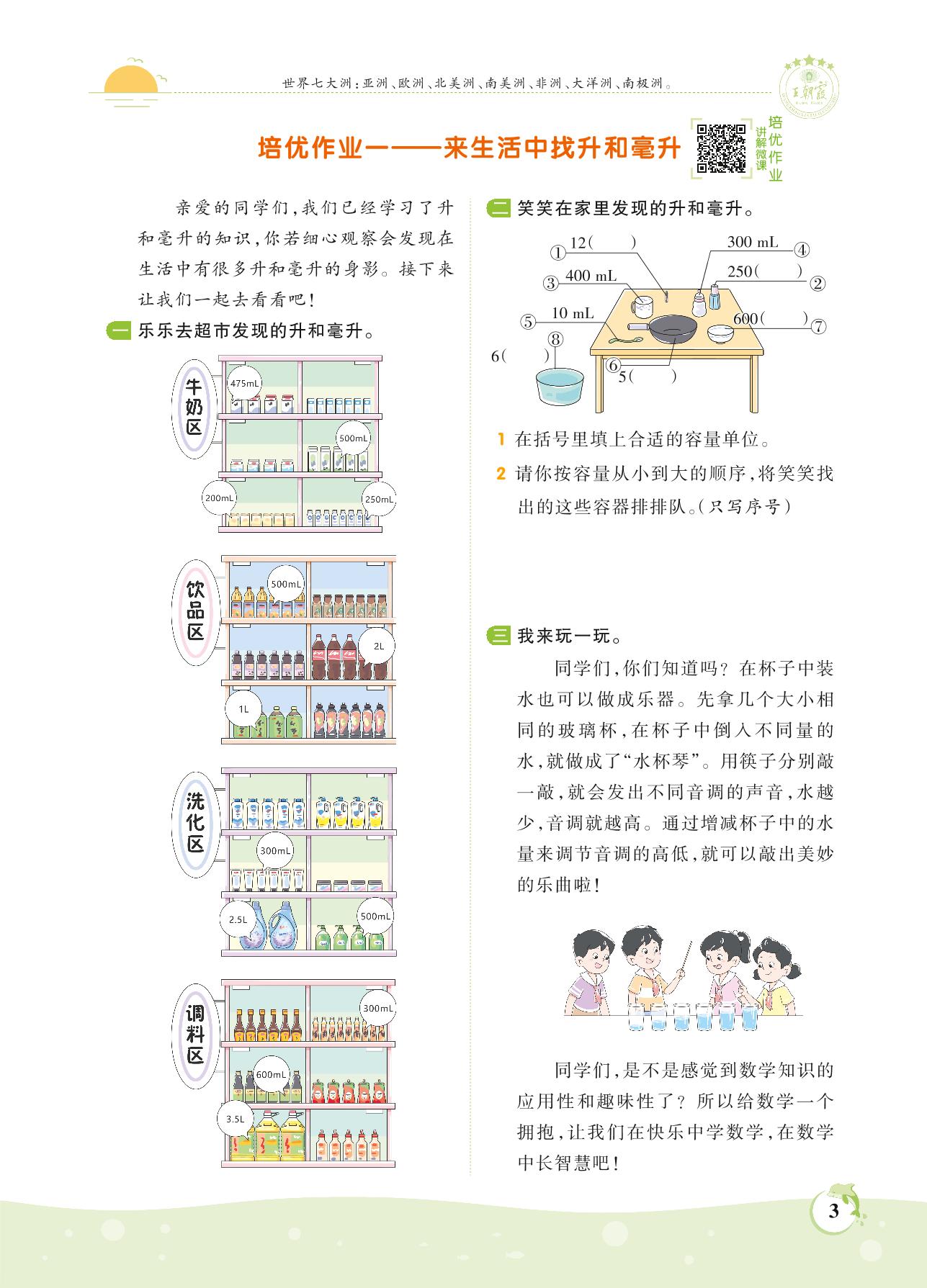 2021上册四年级数学苏教版 第一单元——培优作业一 来生活中找升和毫升