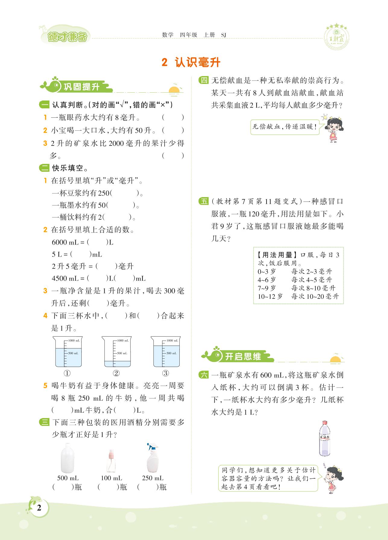 2021上册四年级数学苏教版 第一单元——2 认识毫升