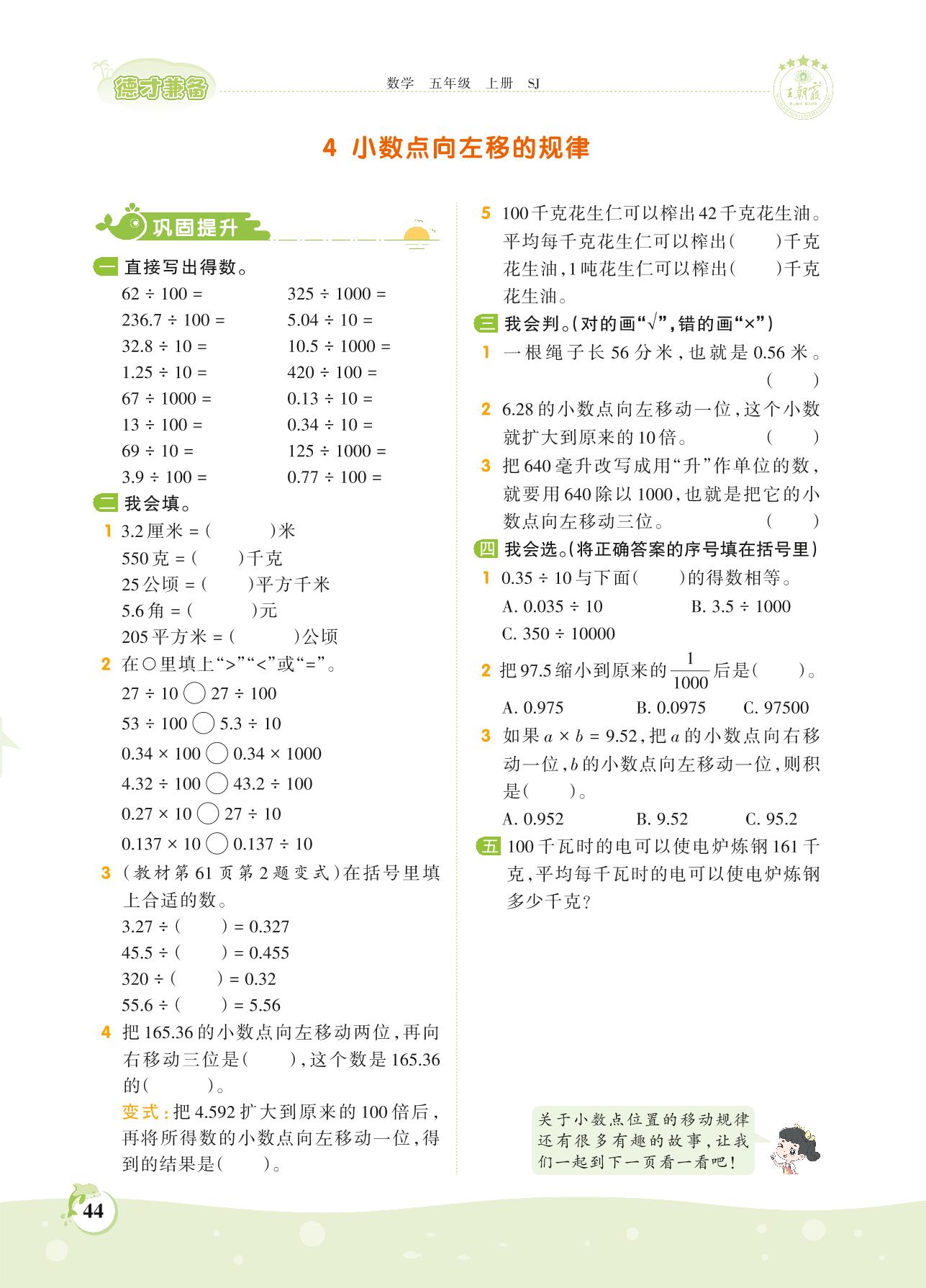 2021上册五年级数学苏教版 第五单元——4 小数点向左移的规律