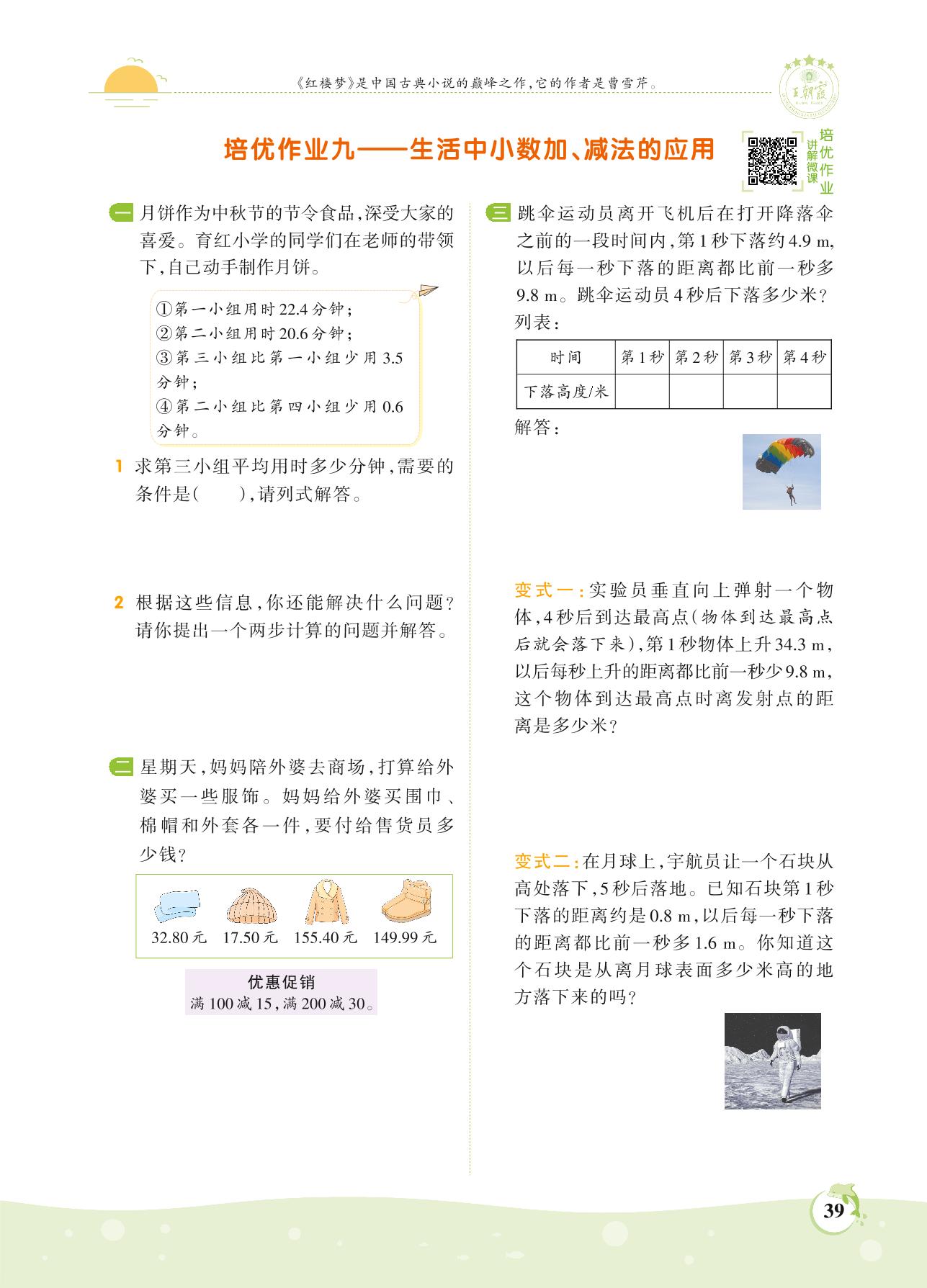 2021上册五年级数学苏教版 第四单元——培优作业九 生活中的小数加、减法的应用