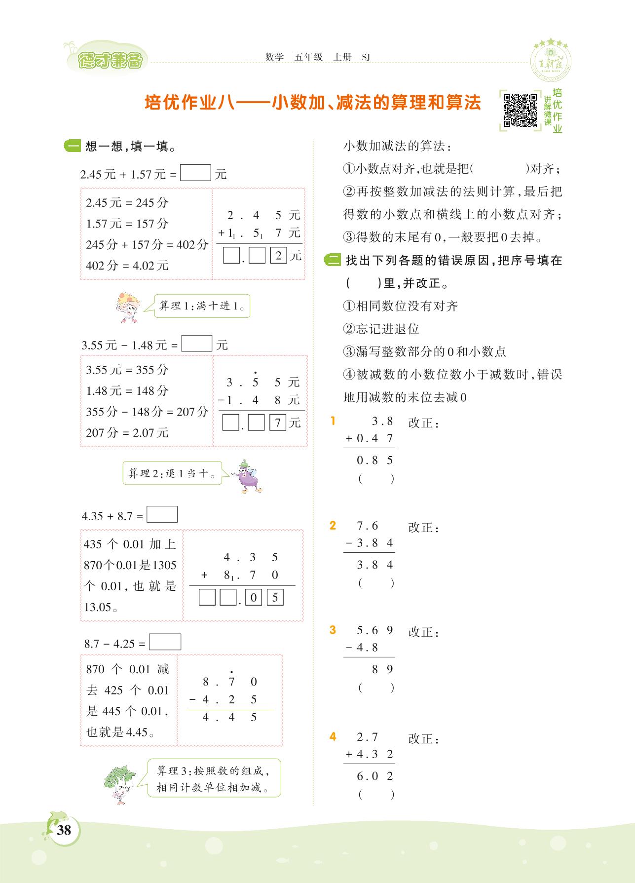 2021上册五年级数学苏教版 第四单元——培优作业八 小数加、减法的算理和算法