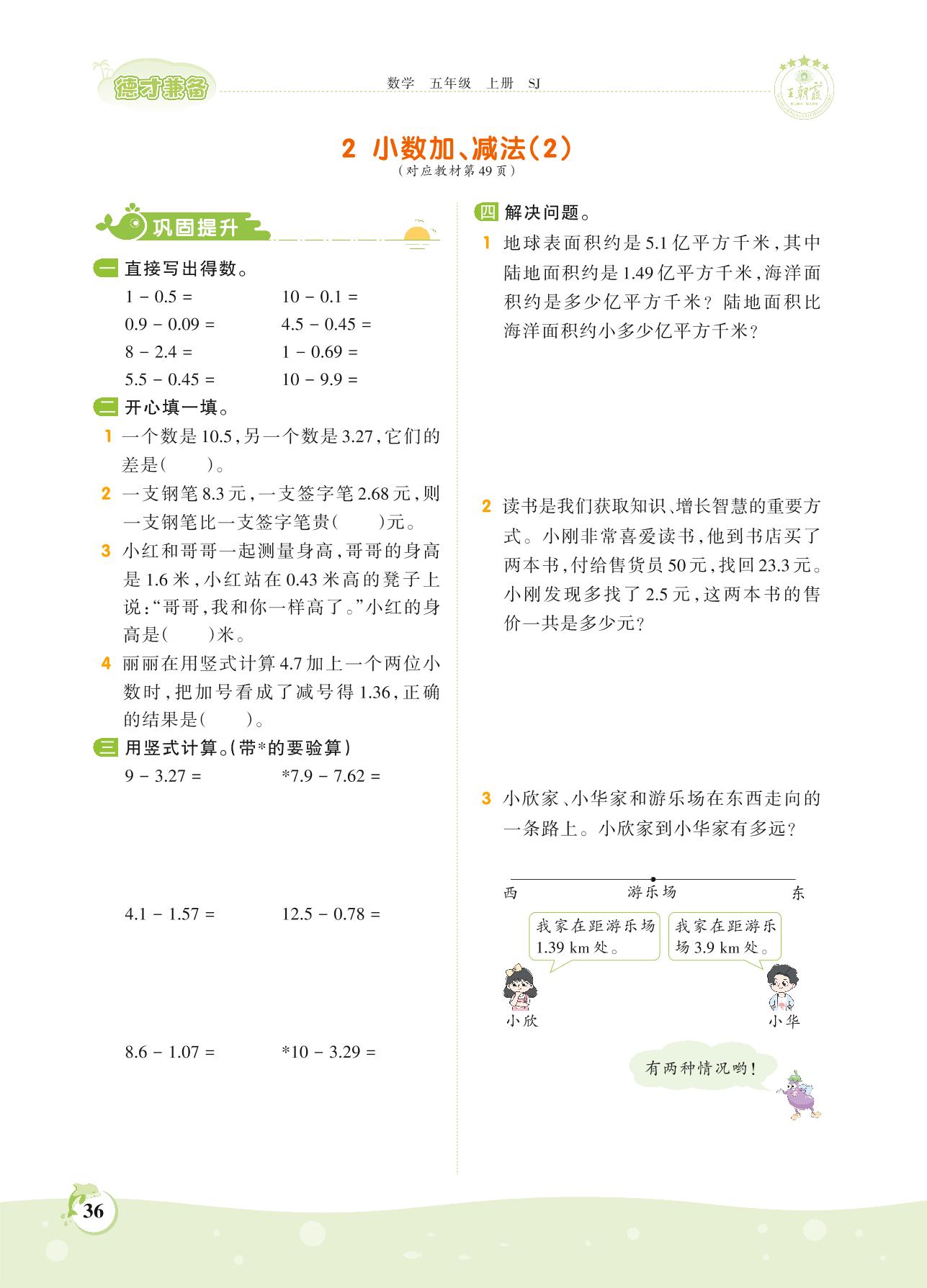 2021上册五年级数学苏教版 第四单元——2 小数加、减法(2)