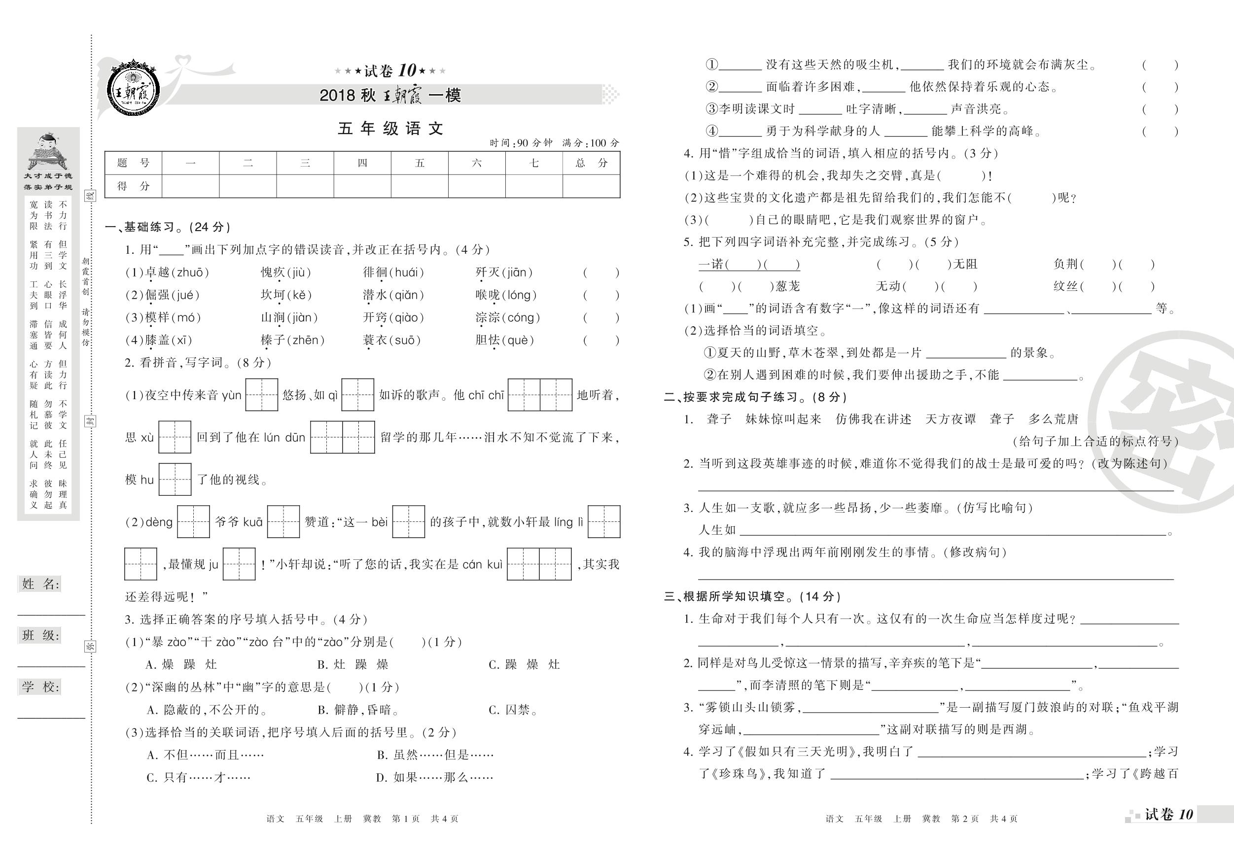 王朝霞期末模拟卷五年级上册语文(冀教版)【10】