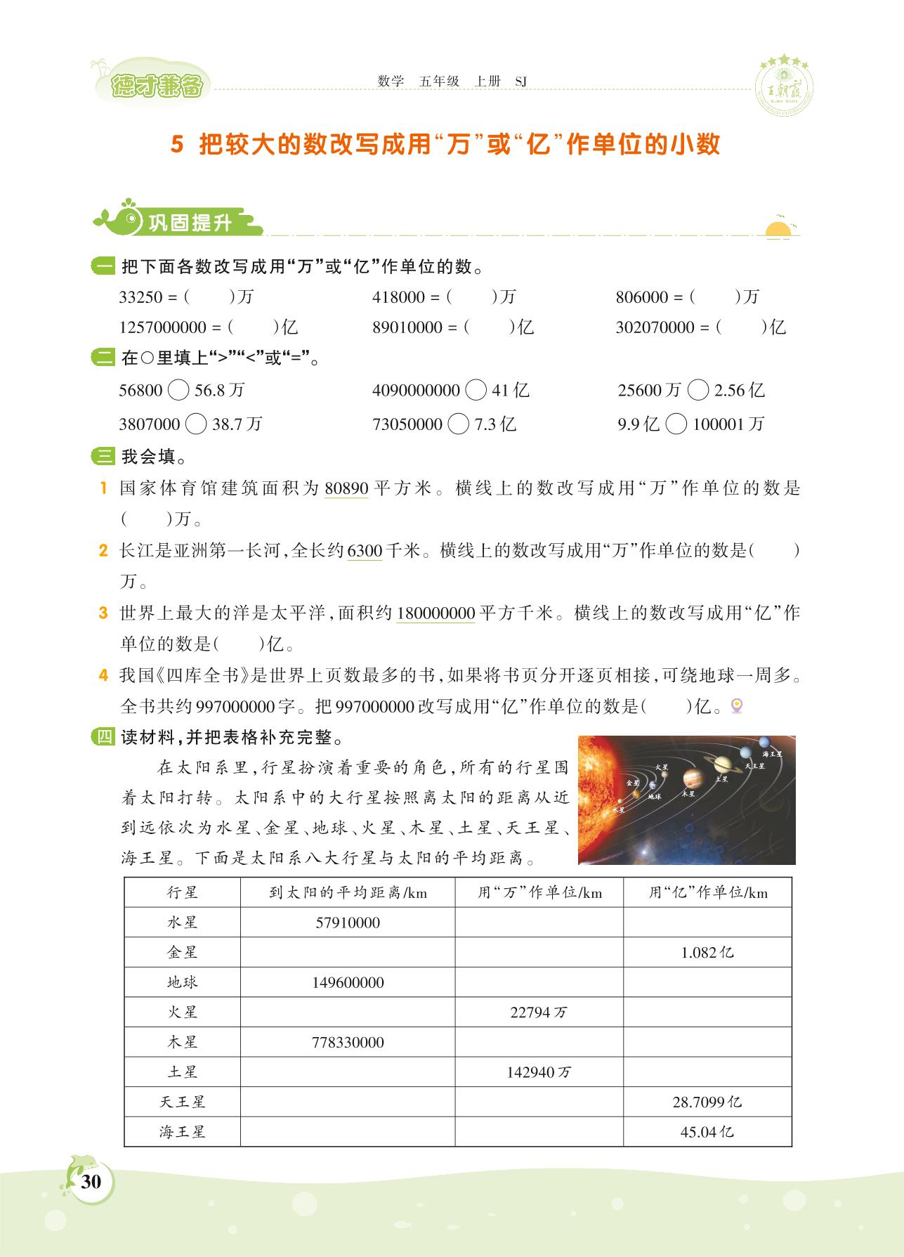 2021上册五年级数学苏教版 第三单元——5 把较大的数改写成用“万”或“亿”作单位的小数