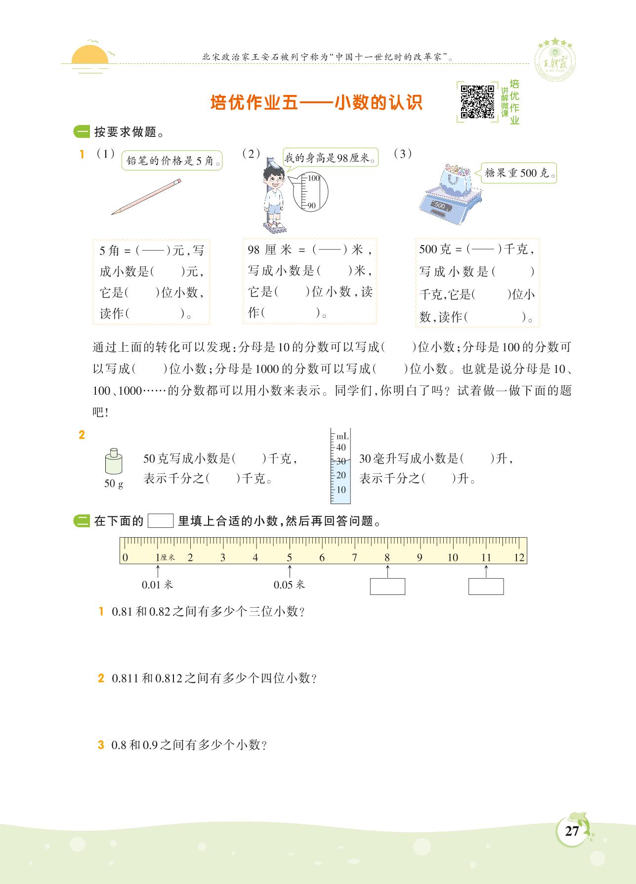 2021上册五年级数学苏教版 第三单元——培优作业五 小数的认识