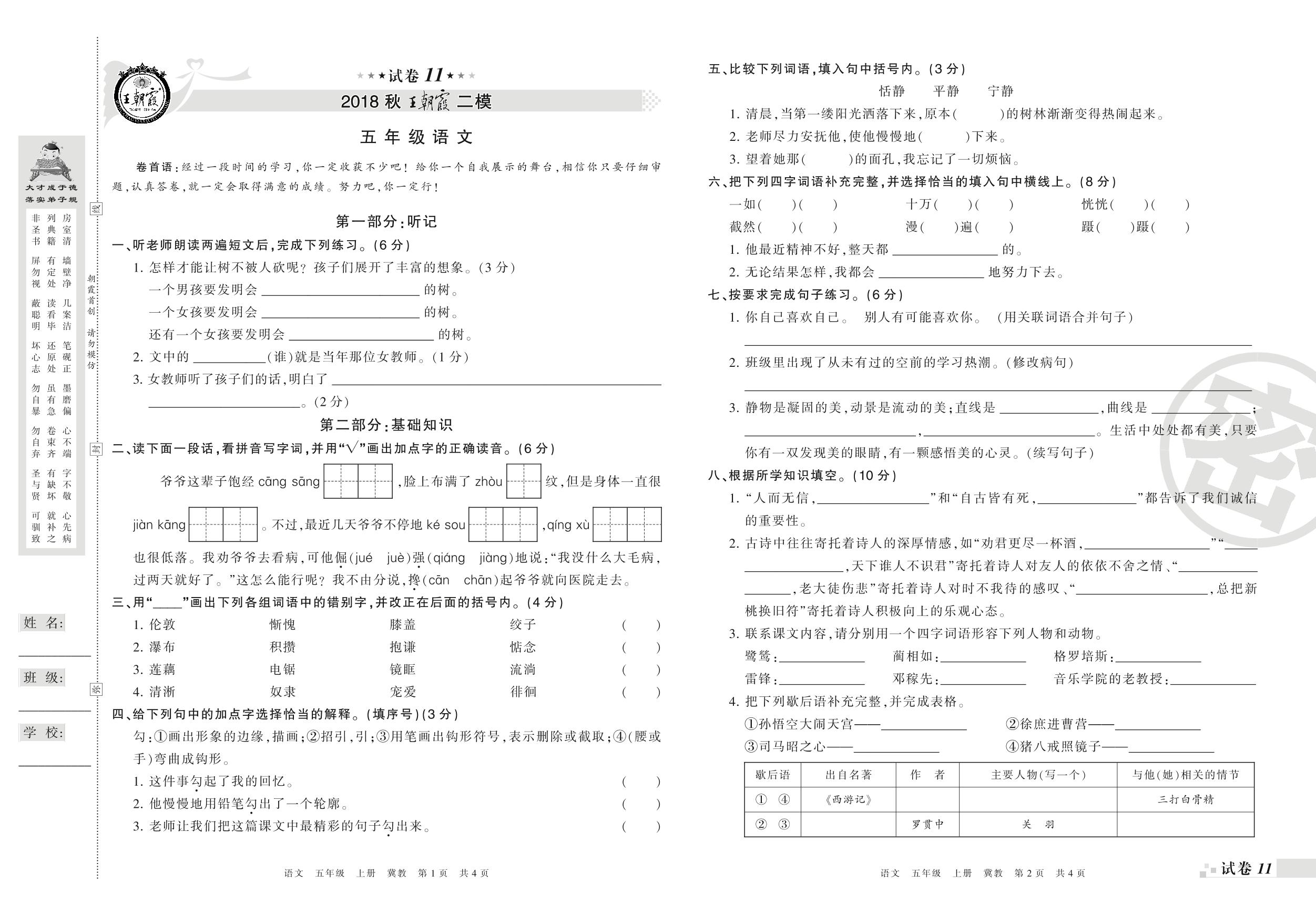 王朝霞期末模拟卷五年级上册语文(冀教版)【11】