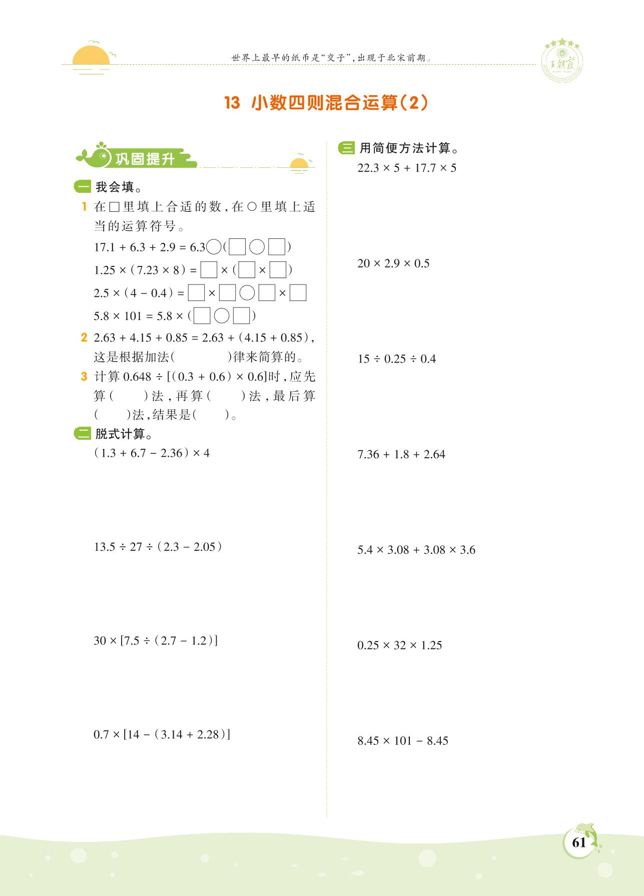 2021上册五年级数学苏教版 第五单元——13 小数四则混合运算(2)