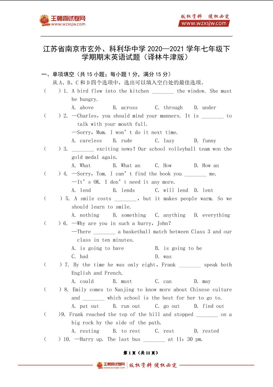 江苏省南京市玄外、科利华中学2020—2021学年七年级下学期期末英语试题(译林牛津版)