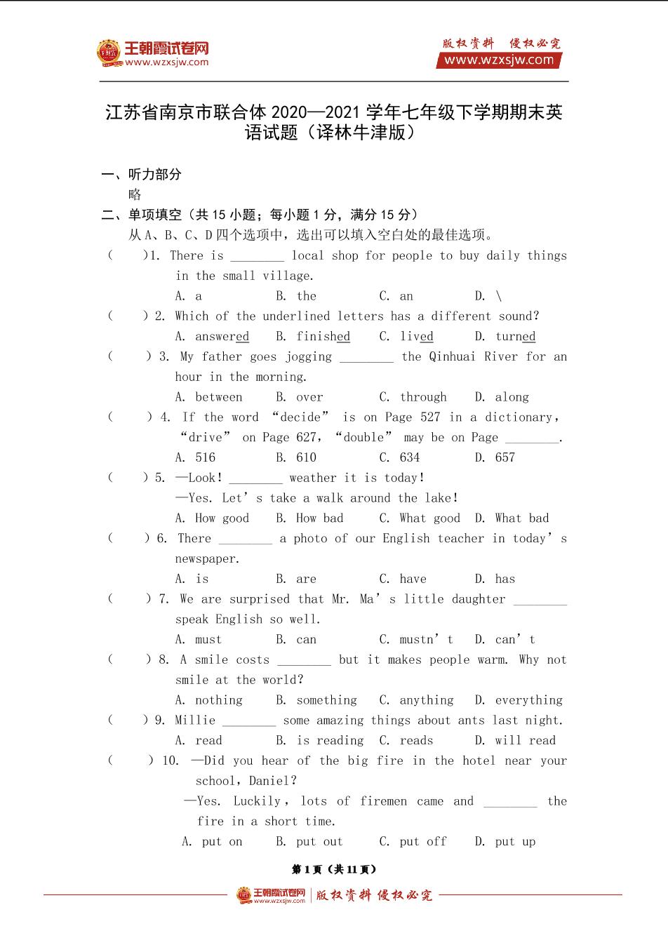江苏省南京市联合体2020—2021学年七年级下学期期末英语试题(译林牛津版)