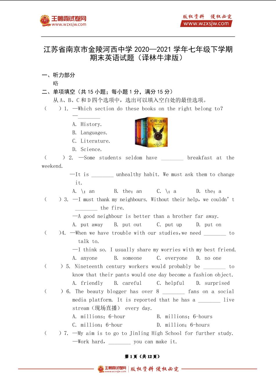 江苏省南京市金陵河西中学2020—2021学年七年级下学期期末英语试题(译林牛津版)