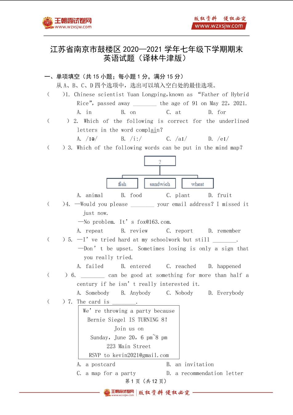 江苏省南京市鼓楼区2020—2021学年七年级下学期期末英语试题(译林牛津版)