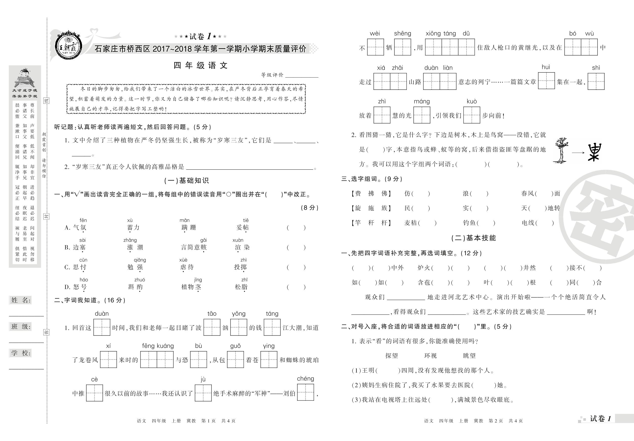 2017-2018学年第一学期石家庄市桥西区四年级语文试卷(冀教版)【1】