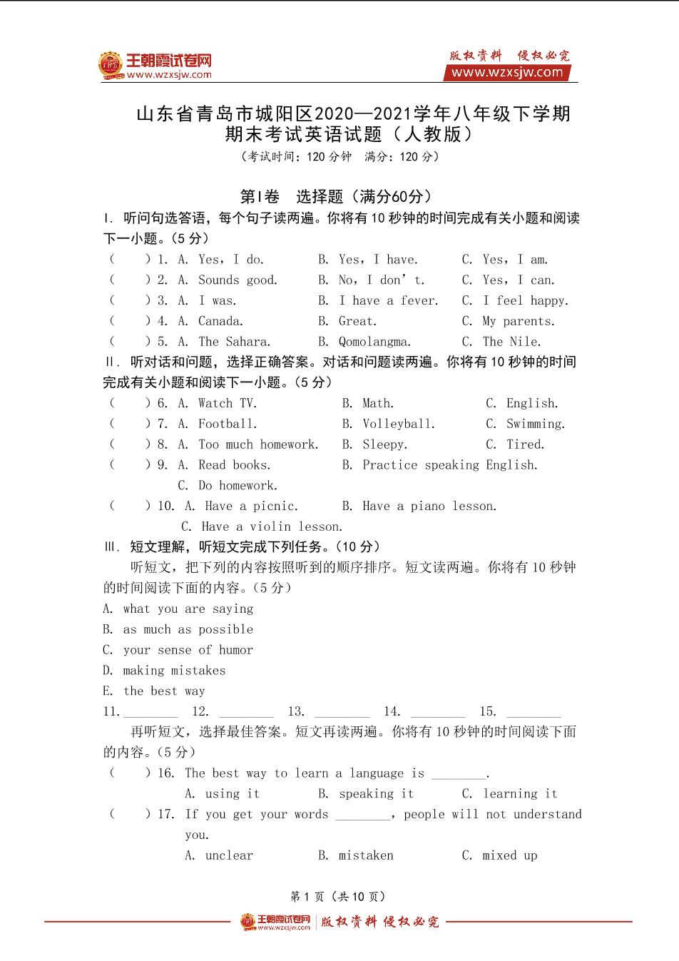 山东省青岛市城阳区2020—2021学年八年级下学期期末考试英语试题(人教版)