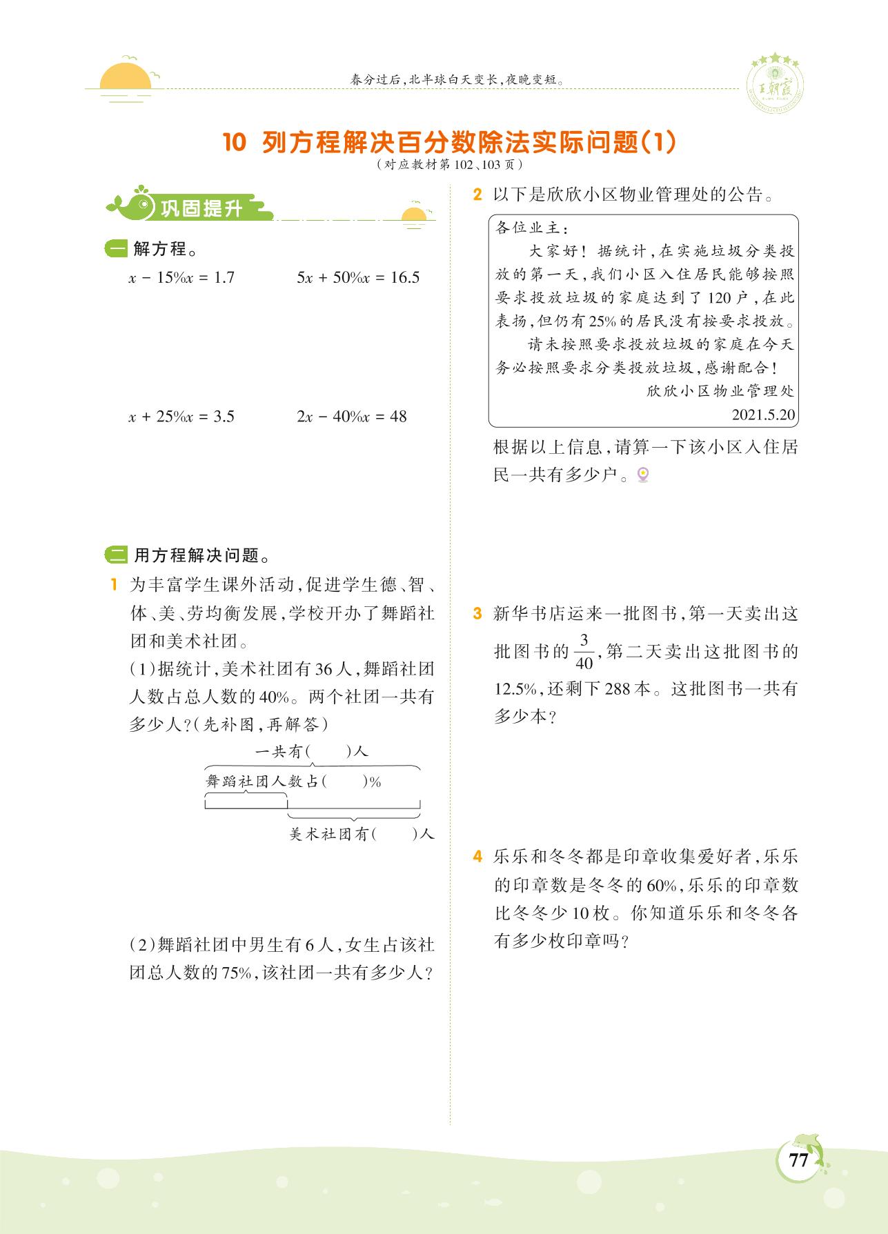 2021上册六年级数学苏教版 第六单元——10 列方程解决百分数除法实际问题(1)