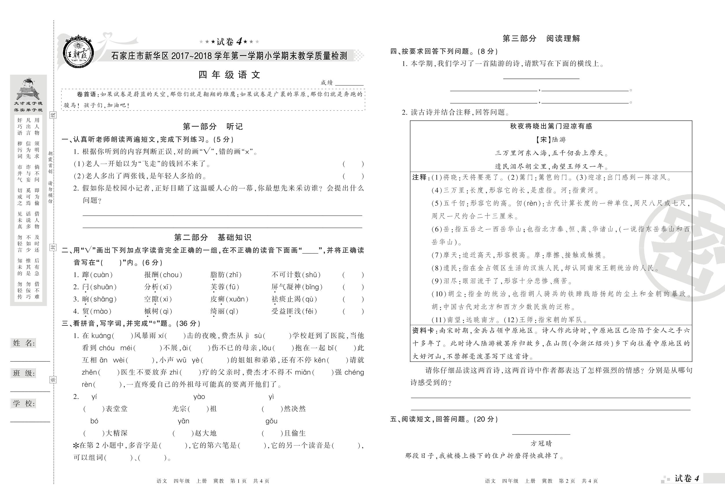 2017-2018学年第一学期石家庄市新华区四年级语文试卷(冀教版)【4】