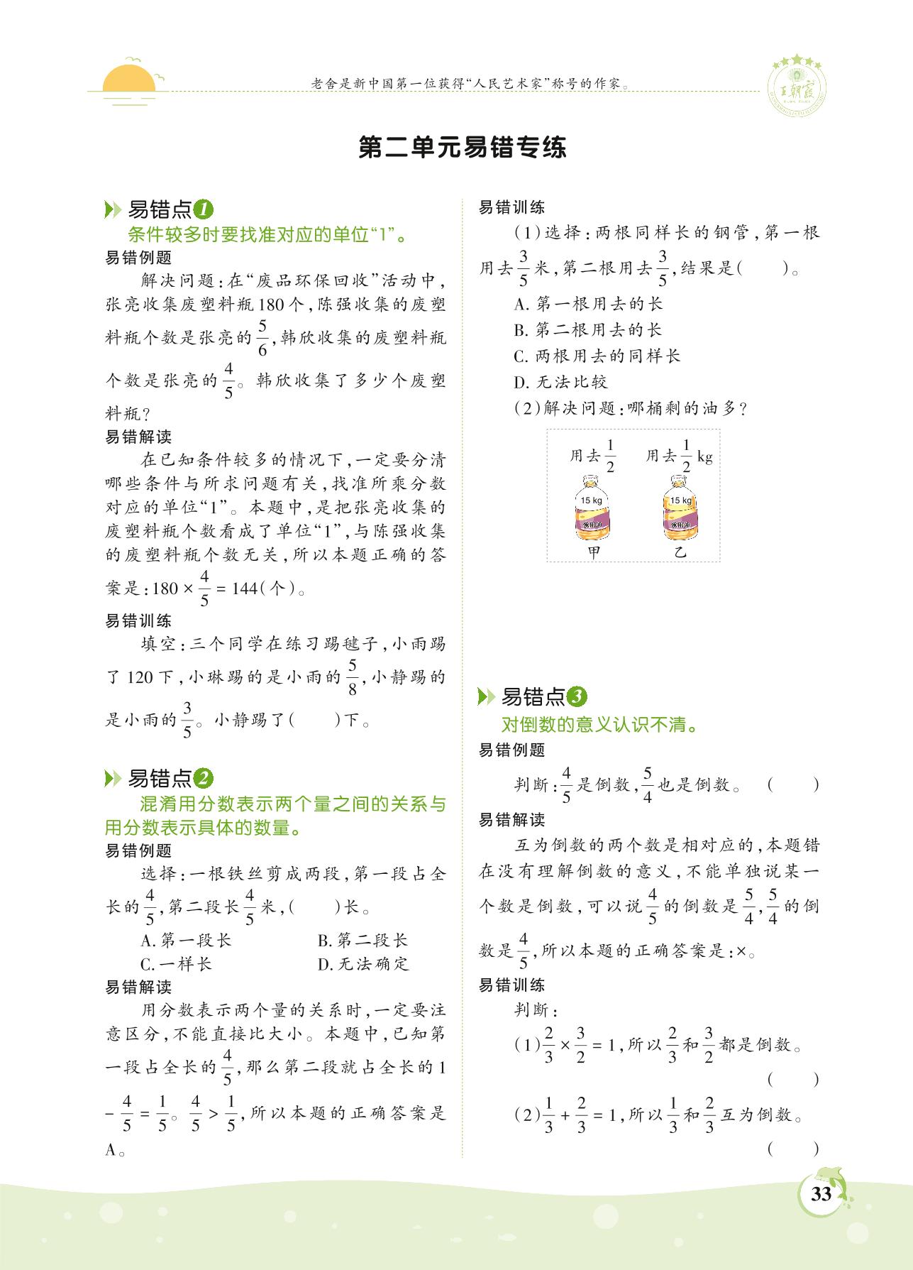2021上册六年级数学苏教版 第二单元易错专练