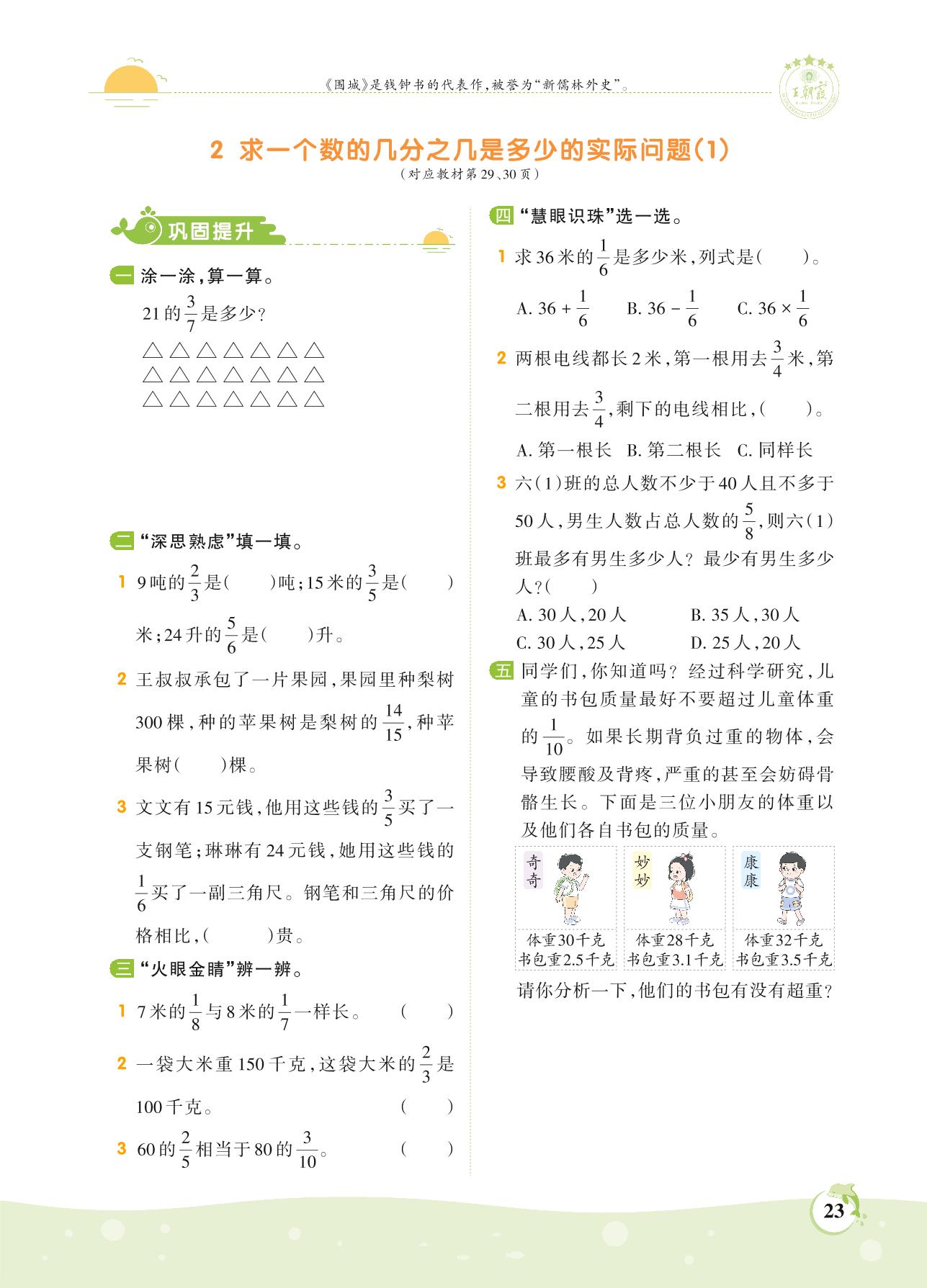 2021上册六年级数学苏教版 第二单元——2 求一个数的几分之几是多少的实际问题(1)