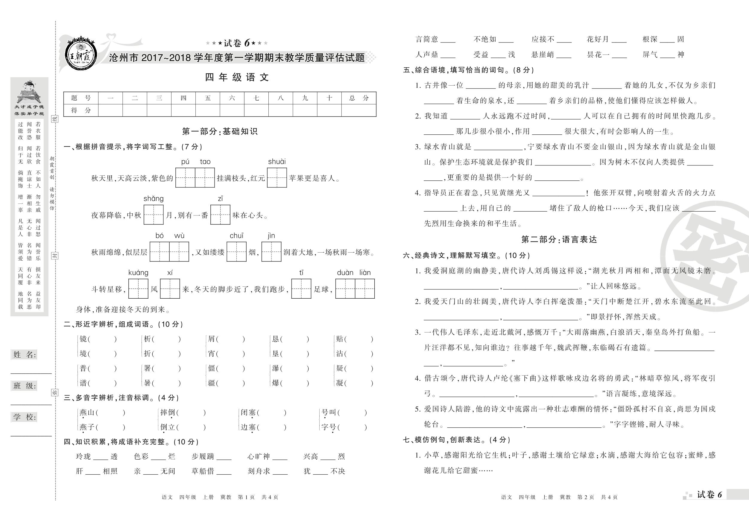 2017-2018学年第一学期沧州市四年级语文试卷(冀教版)【6】