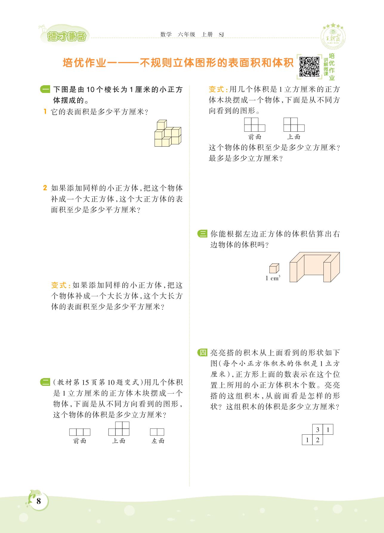 2021上册六年级数学苏教版 第一单元——培优作业一 不规则立体图形的表面积和体积