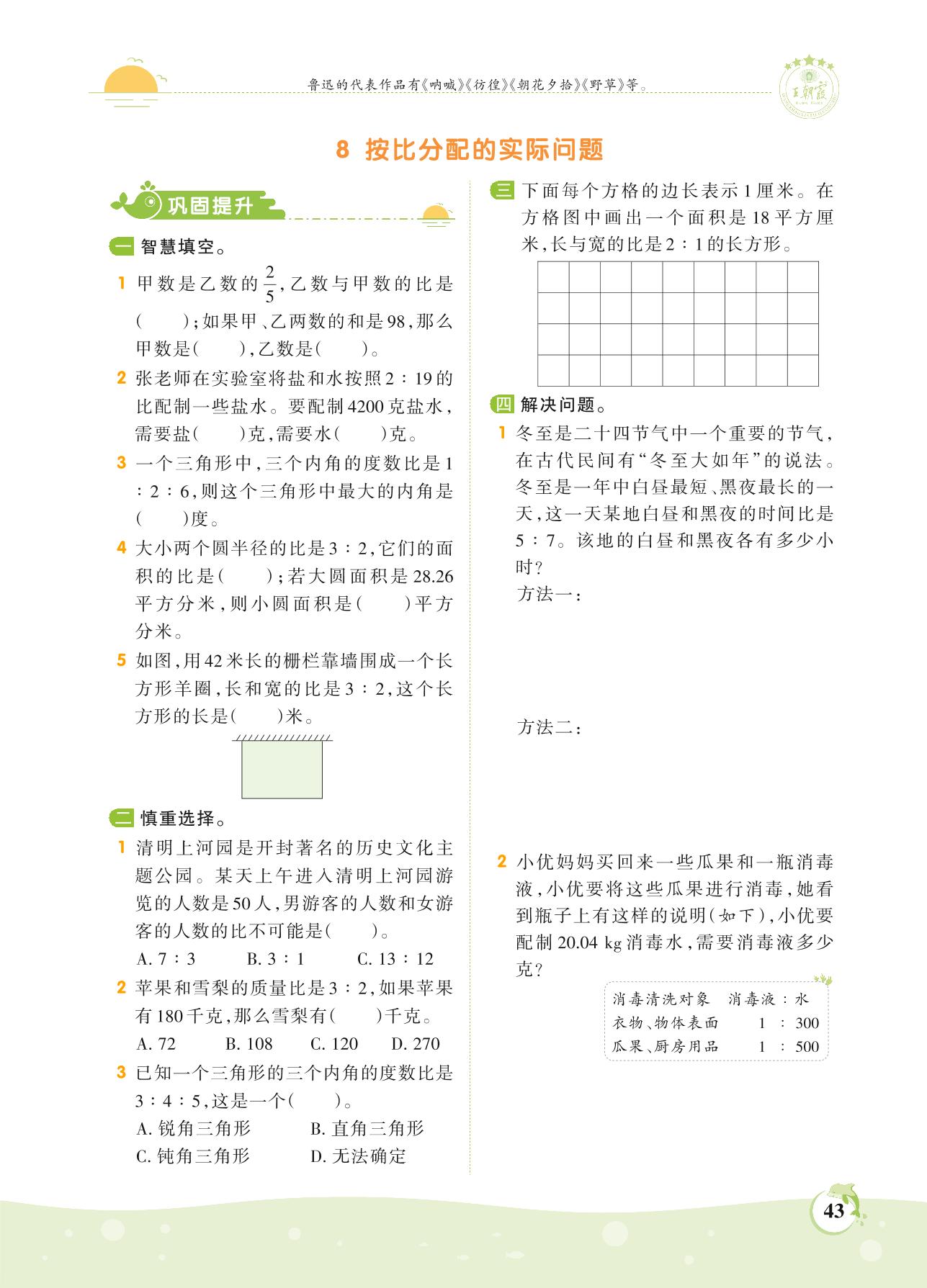 2021上册六年级数学苏教版 第三单元——8 按比分配的实际问题